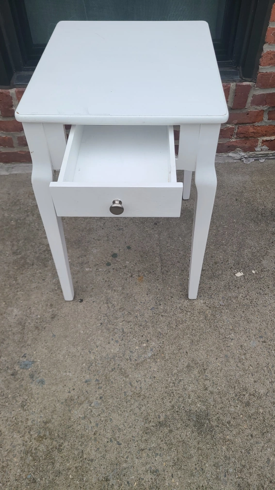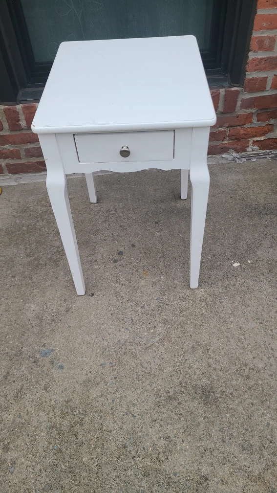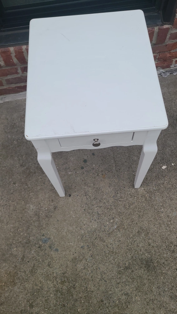 93White end table with one drawer. The table measures 19 inches tall, Nice and antique piece of furniture, that hard to found, white color, has a small drawer. Can be as night stand or corner decor. Measure 19 inch long by 15.5 inch wide by 24 inch high g room.