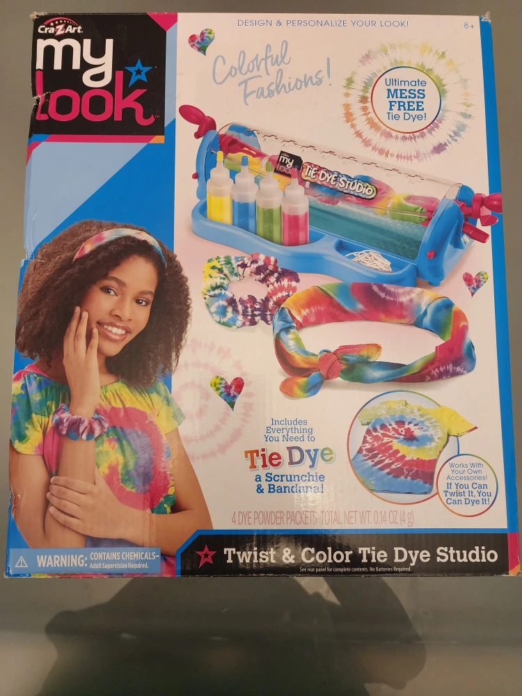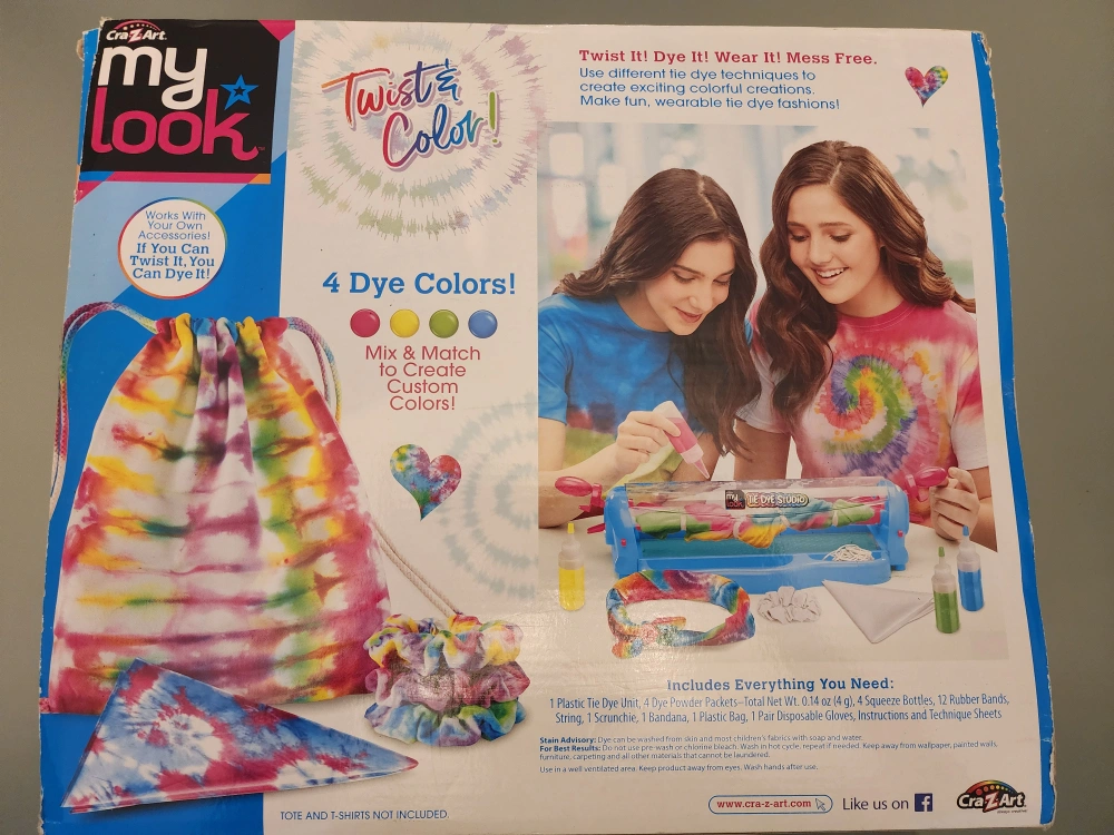 114This set includes everything you need to create your own colorful tie dye fashions. Box Includes Includes: -1 plastics Tie Dye Unit -4 Dye Powder Packets -4 Squeeze Bottles -12 Rubber Bands -Strings -1 Scrunchie -1 Bandana -1 Plastic Bag -1 Pair Disposable Gloves - Instructions and Technique Sheets Box is poor condition