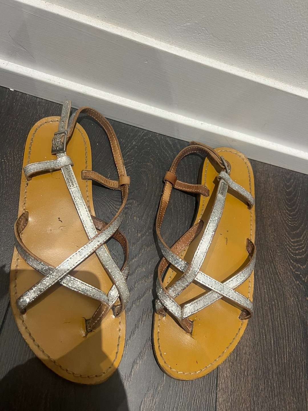 Step into elegance with Les Tropeziennes sandals, a renowned French brand. Their stunning shining silver finish adds a touch of glamour to any outfit. Perfect for both beach days and nights out, these sandals offer comfort and style in every step. They have a buckle ankle strap.
