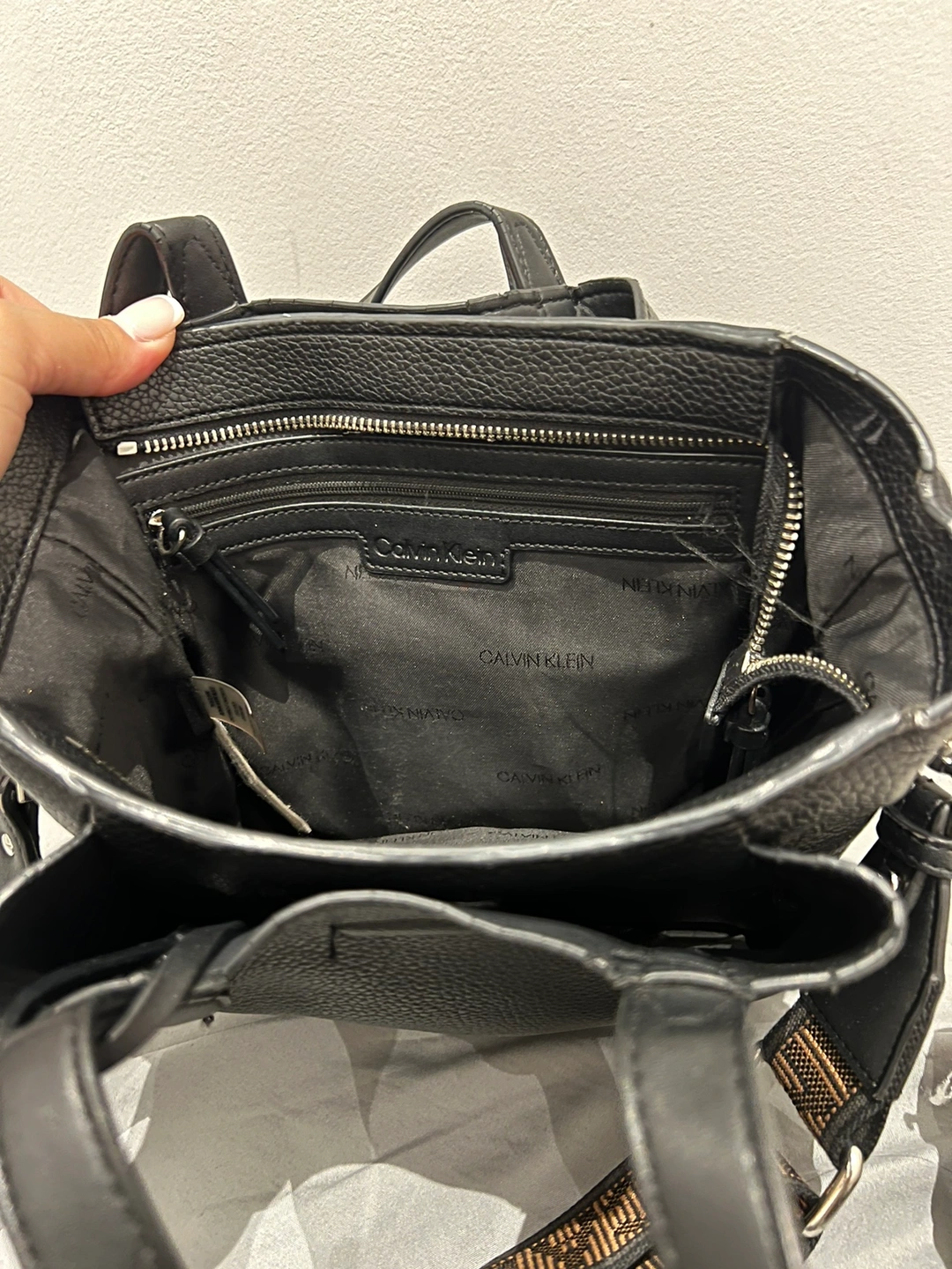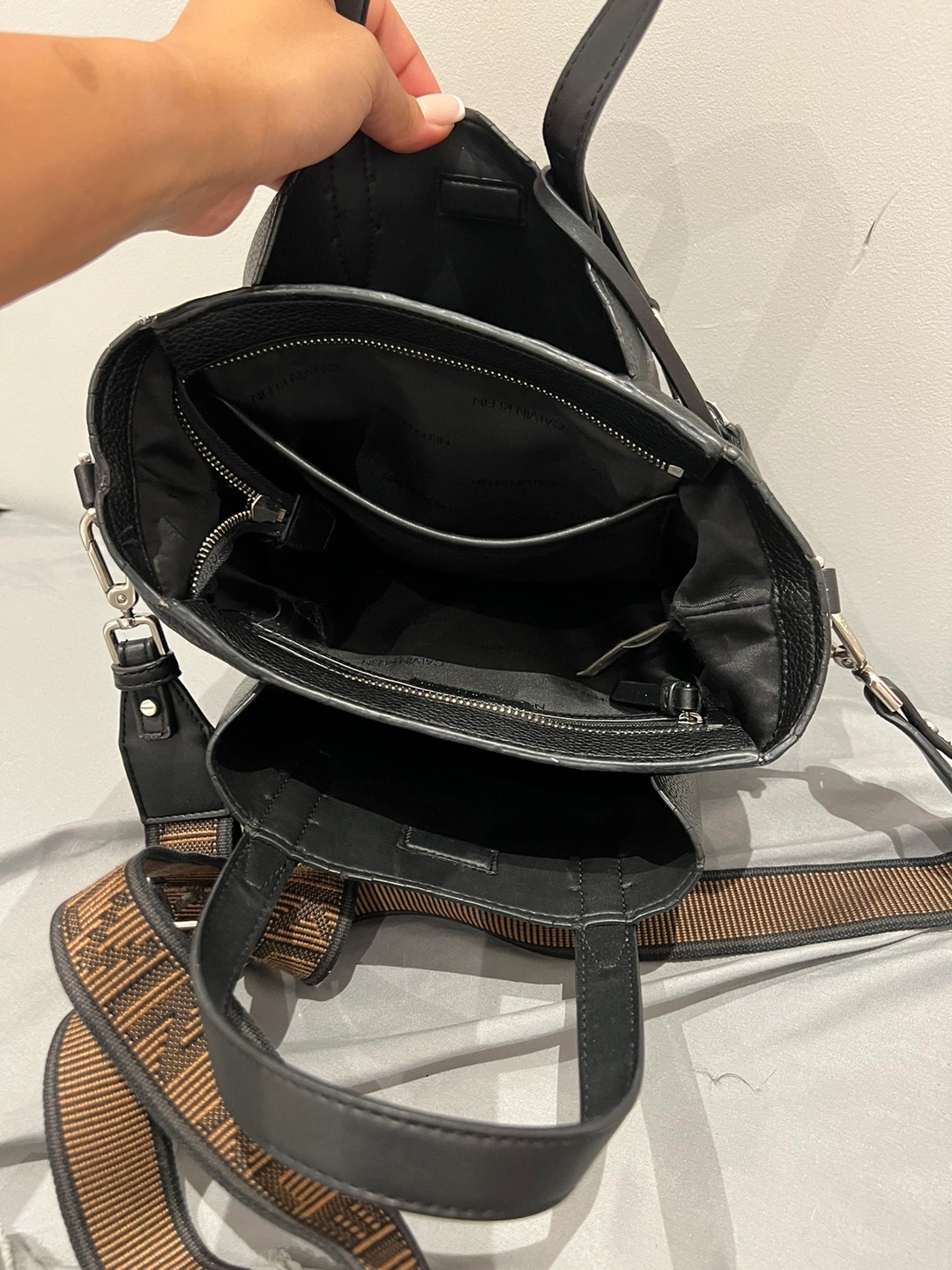 Black Calvin Klein handbag with adjustable strap. The bag also has top handles and comes with a small coin purse with a Calvin Klein logo. The bag features a zippered compartment and a slip pocket in the interior. The handbag is in great condition because it’s split into 3 pockets as well as it’s I. A very good condition .