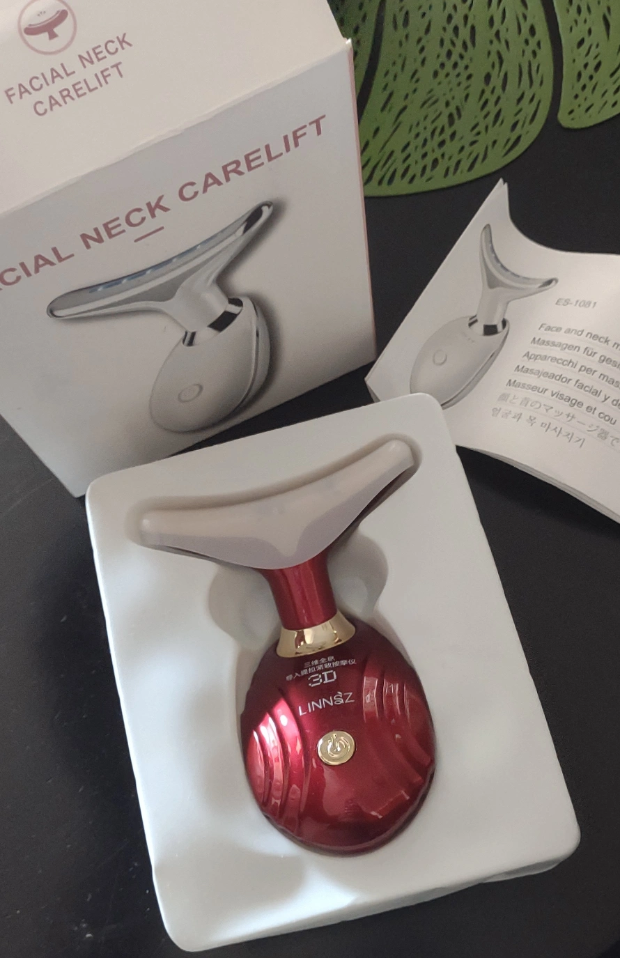 381This is a red facial and neck massager. It comes in a white box and appears to be in new condition,it only vibrates it doesn't heat up or light up.