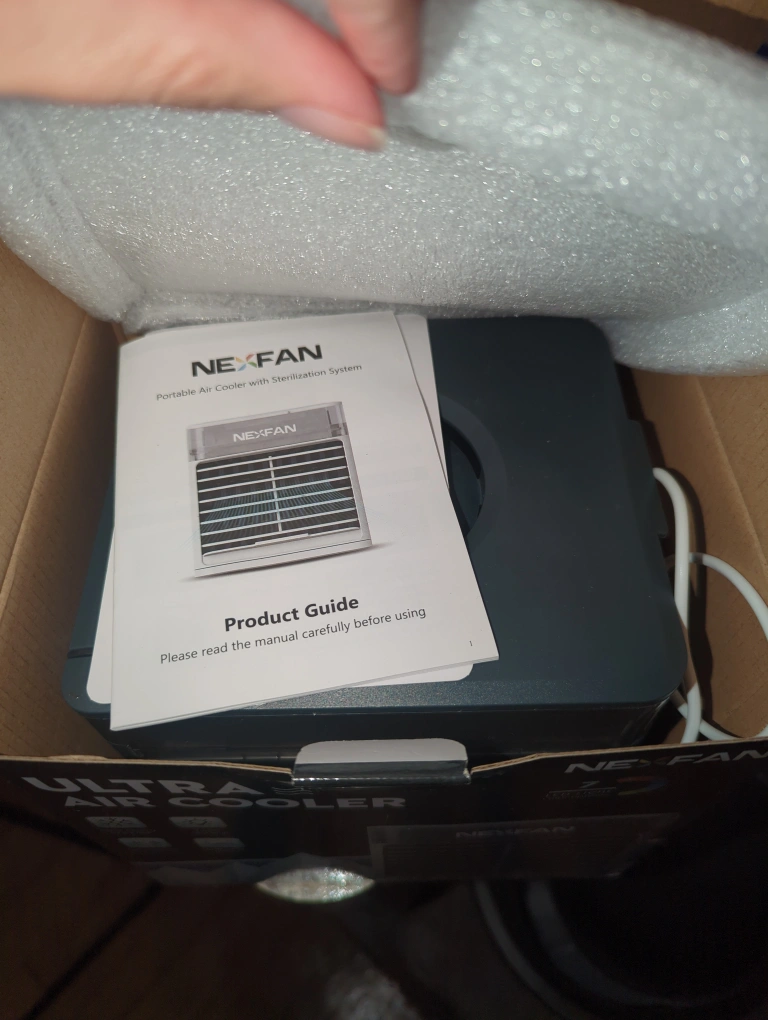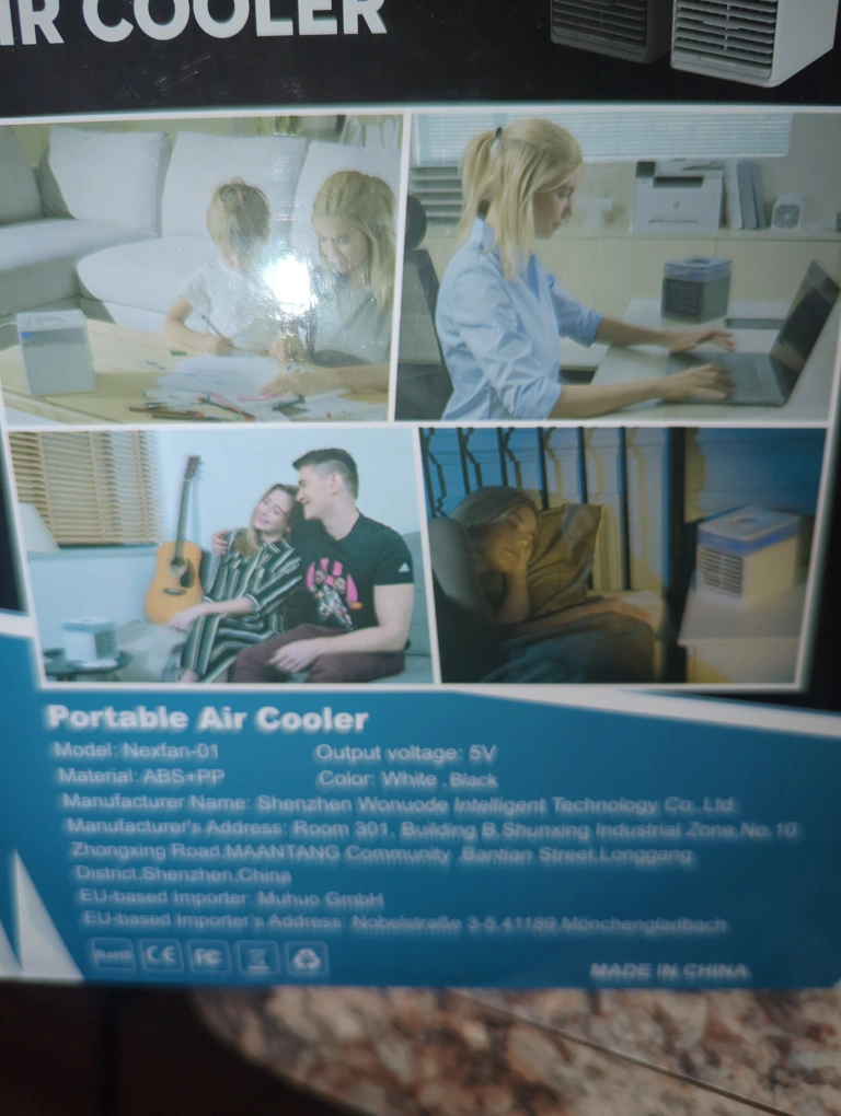 This is a small, portable air cooler. It is white and black in color. It is in the original box with instructions included. It plugs into a wall outlet with a USB cord (cord not included). This air cooler is perfect for a small room or office.