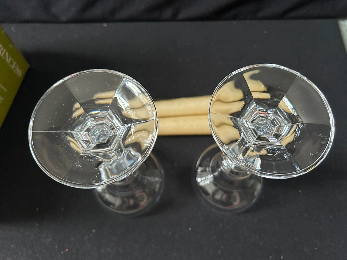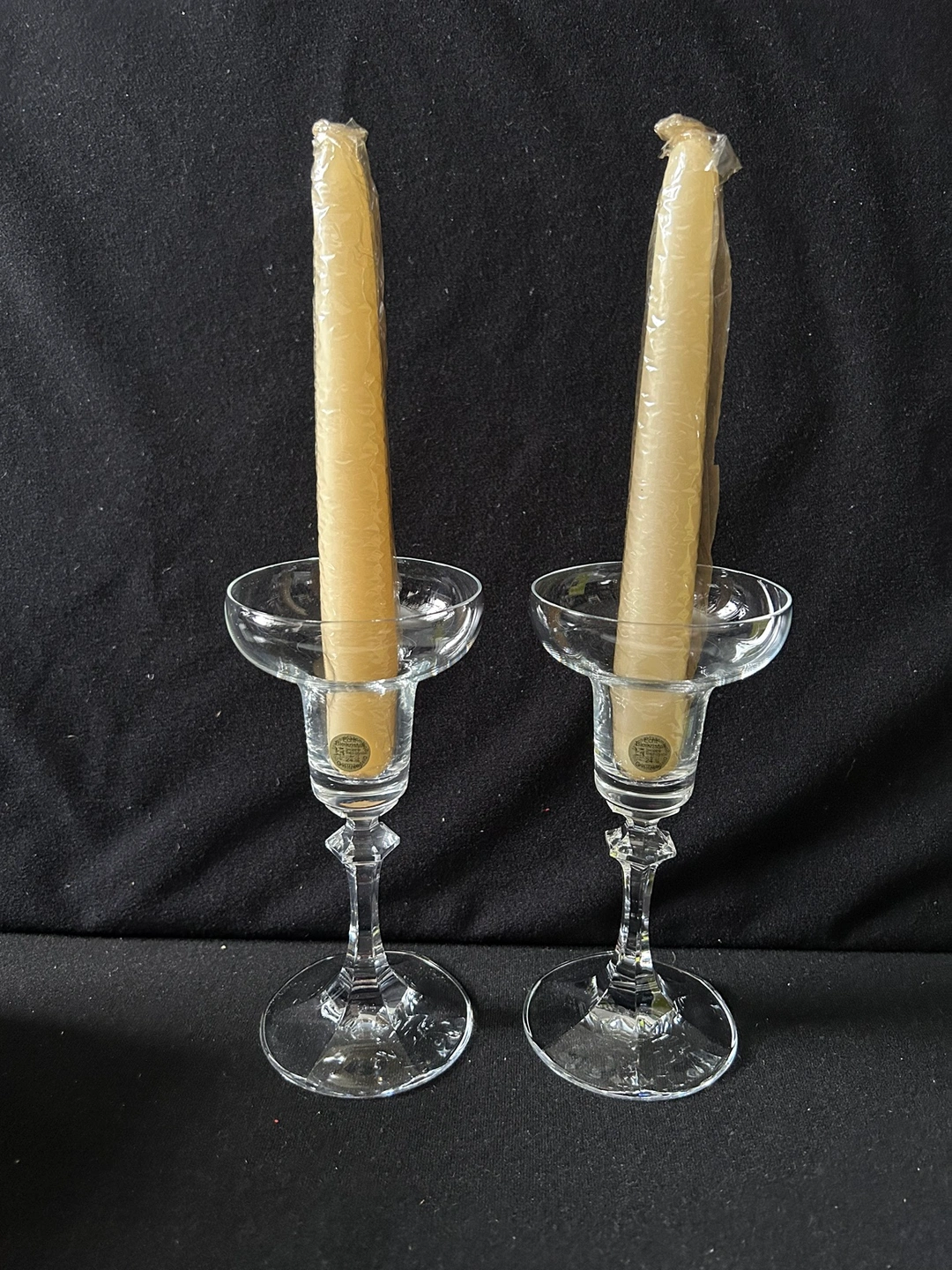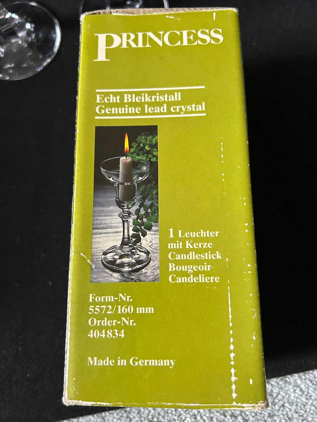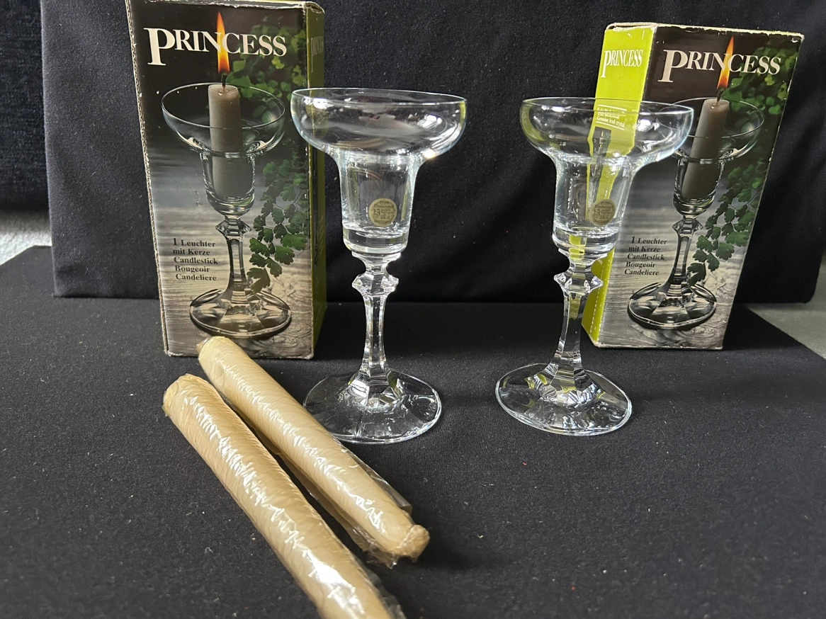 15Set of 2 Brand New Princess Echt Bleikristall 24% Genuine Lead Crystal Candelieres (Candle Holders) with Candles Approximately 6 1/2” each Brand New in *Boxes Never Used The Candles are approximately 7 1/2” each (please see photos: slight indentations towards bottoms of the candles but that shouldn’t affect using them and you can use your own candles). *note that the boxes are not in very good condition, but that doesn’t effect the Candelieres (Candle Holders). Please see photos. Please be able to meet in Forest Hills, Queens, (occasionally in Manhattan) and take a look at my other postings too!