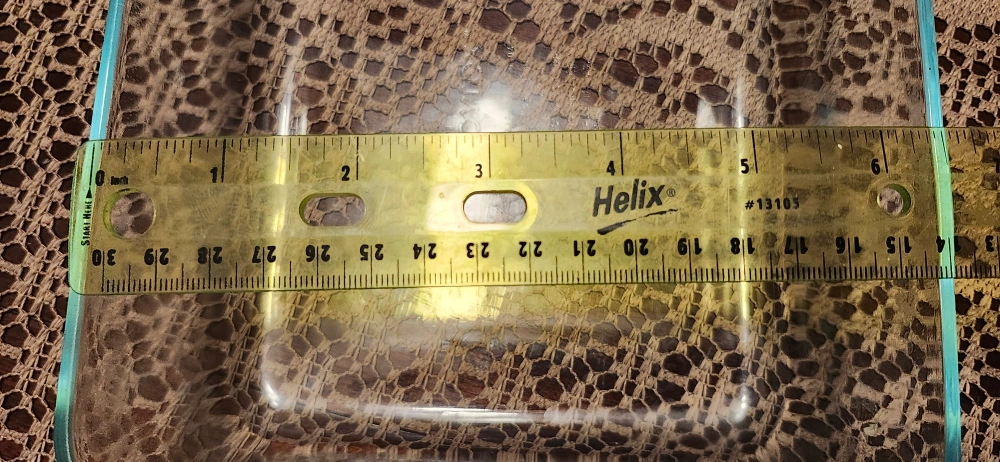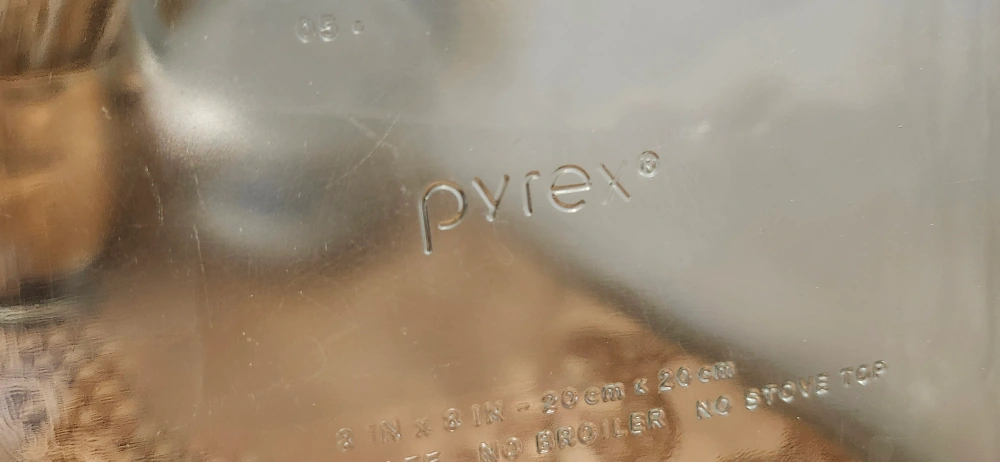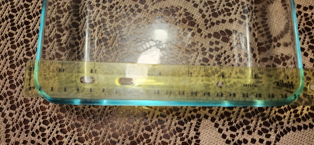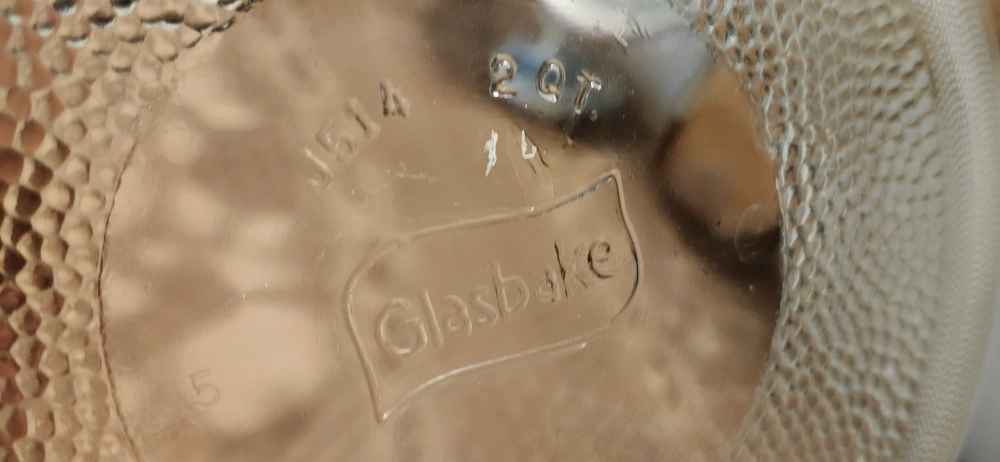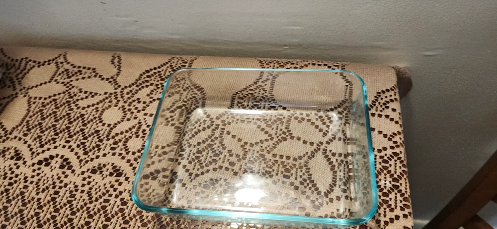 Glassbake 2 Qt baking dish with handles. Square shape and 1 round The dish measures approximately 8 inches across and 2 inches deep.