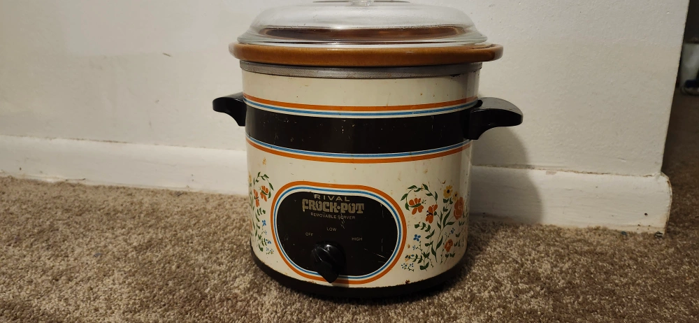 Vintage Rival Crock-Pot with removable server. Has floral pattern and is in good condition. There are some small scratches. Includes lid. Measures approximately 6.5" in diameter and 7" tall.