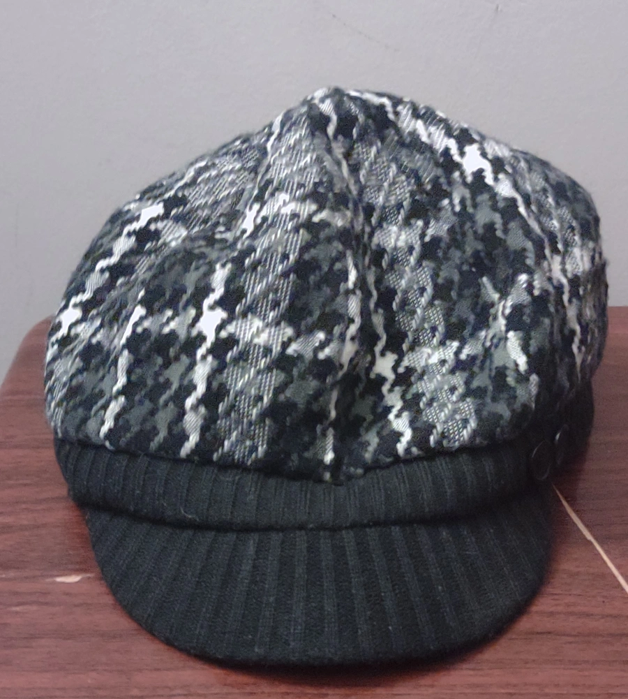 381Black, white, and grey plaid newsboy cap with a black knit band.
