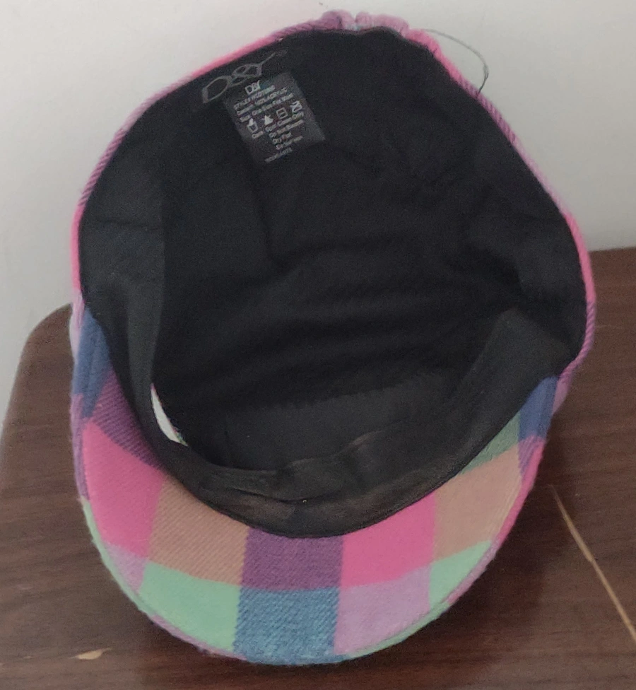381A cute plaid hat with a bow in the back,will not fit a big head.