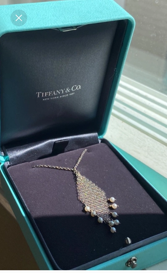 484A silver chain necklace with a mesh pendant and pearl accents. The necklace is in a Tiffany & Co. box.