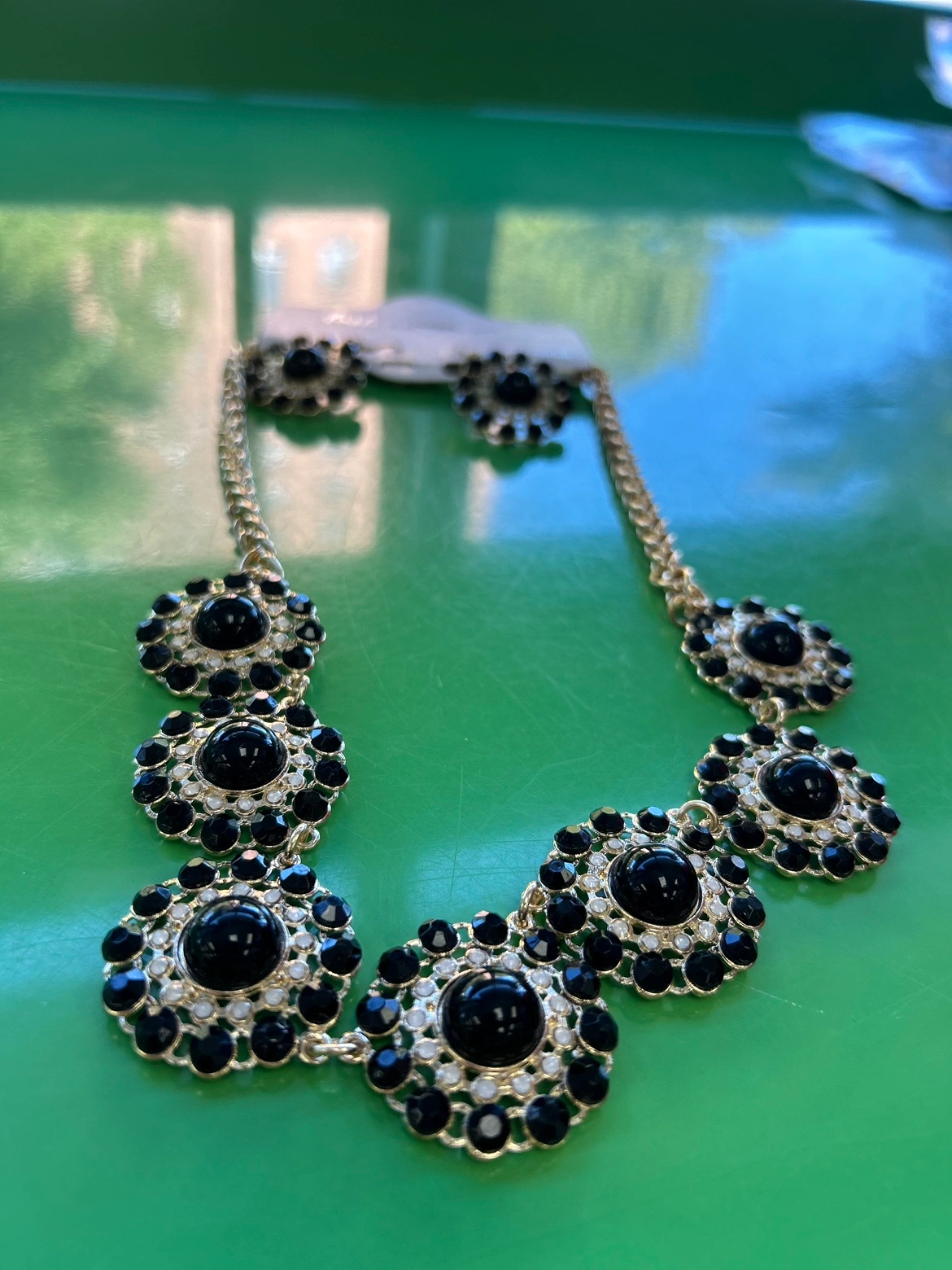A gold chain necklace with black and white rhinestone circular accents. It is approximately 17 inches long. The necklace comes with matching earrings.