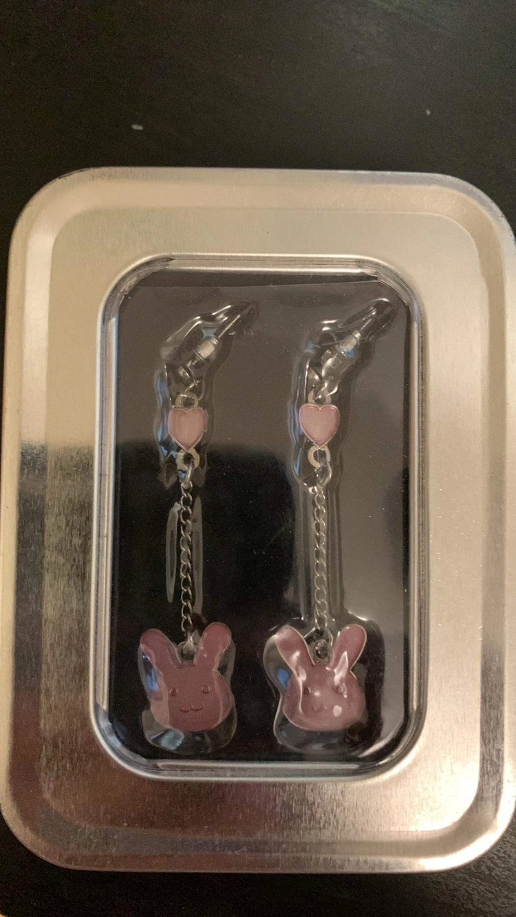 Cute pink bunny earrings that come in a tin box. Has been sitting in storage for a while but is unworn.