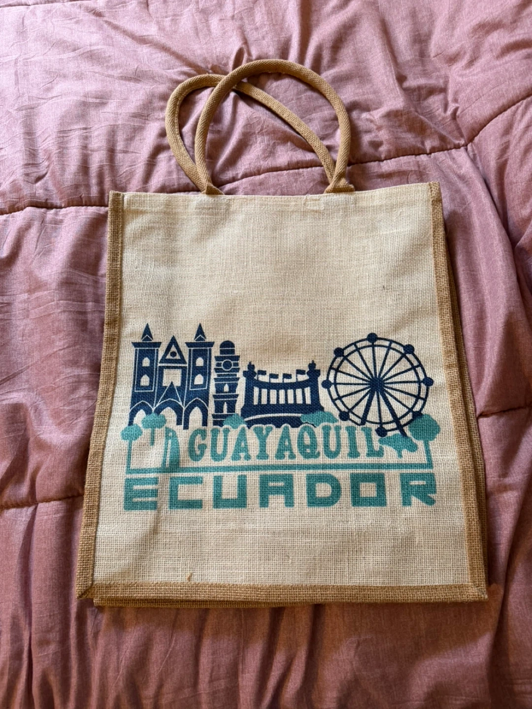 Jute tote bag with handles featuring a cityscape design of Guayaquil, Ecuador. Natural jute material with brown trim and rope handles. It's a reusable bag perfect for shopping or travel.