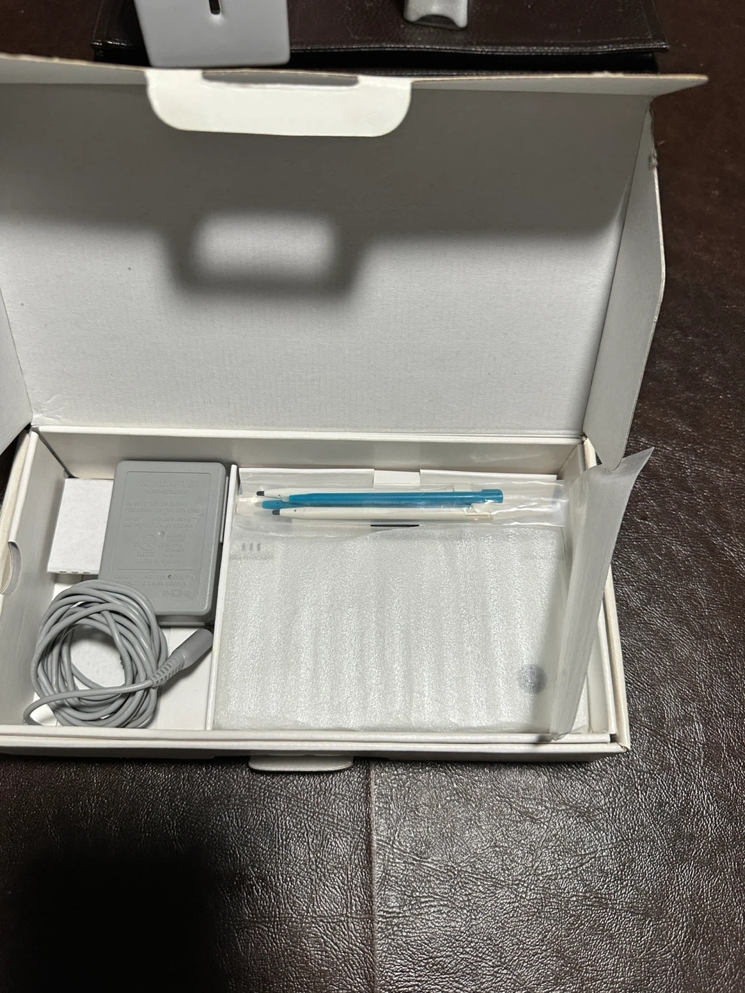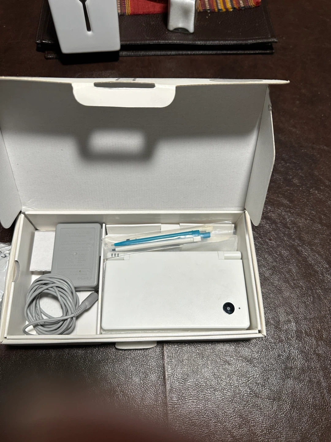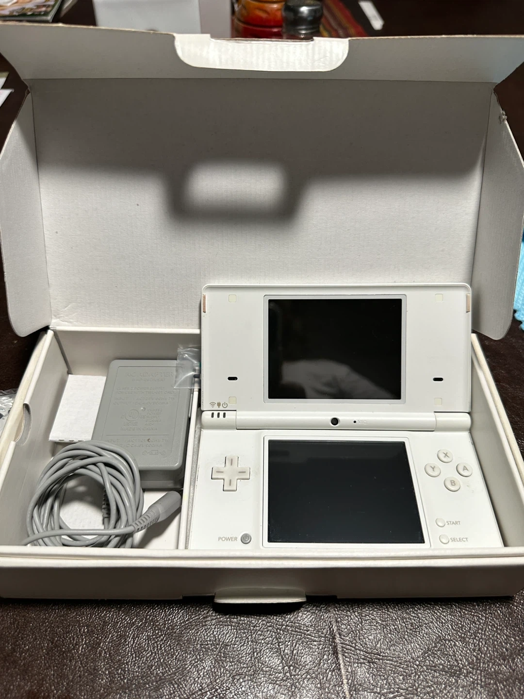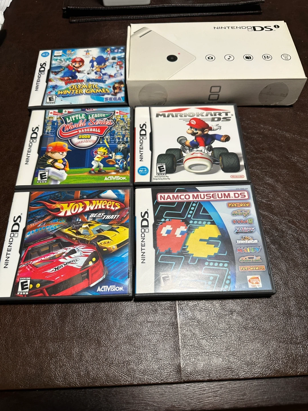 White Nintendo DS Lite console with charger, stylus, and original box. Includes games: Mario Kart DS, Hot Wheels Beat That!, Little League World Series Baseball, Namco Museum DS, and Mario & Sonic at the Olympic Winter Games. It's a complete package for gaming fun!