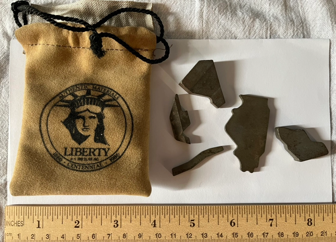 Actual metal pieces from when statue was repaired. Comes with a cloth drawstring bag featuring the Statue of Liberty. Sold in 1986 for statue’s centennial