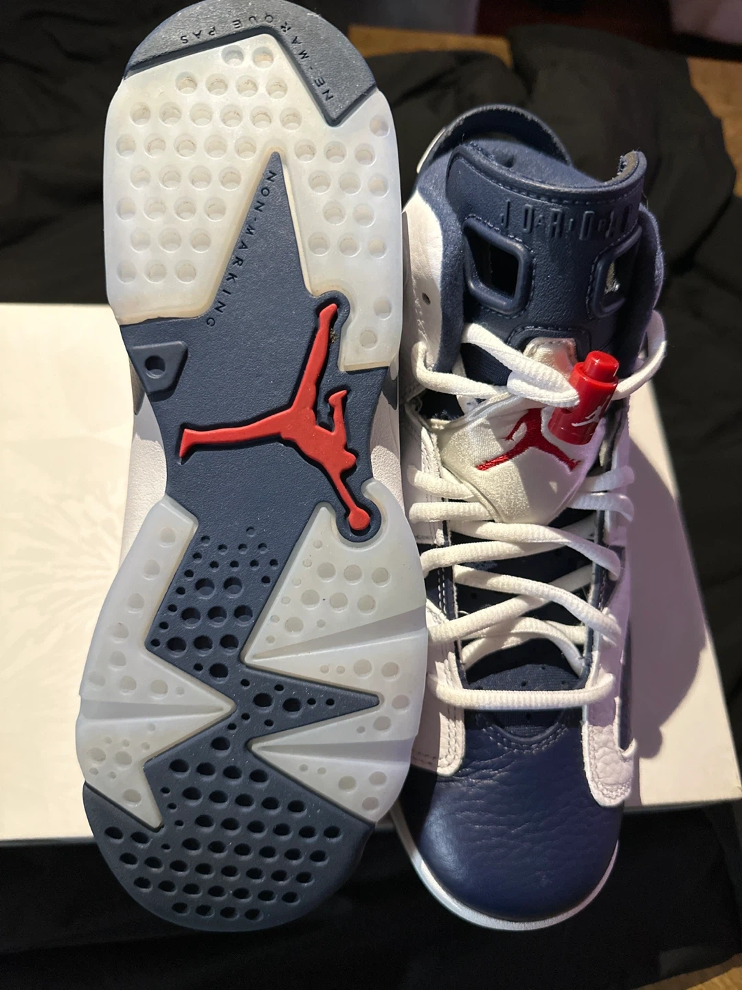 These Air Jordan 6 Retro sneakers come in a "Midnight Navy" colorway. They're crafted with a mix of leather and textile for a comfortable fit. Includes original box and laces.
