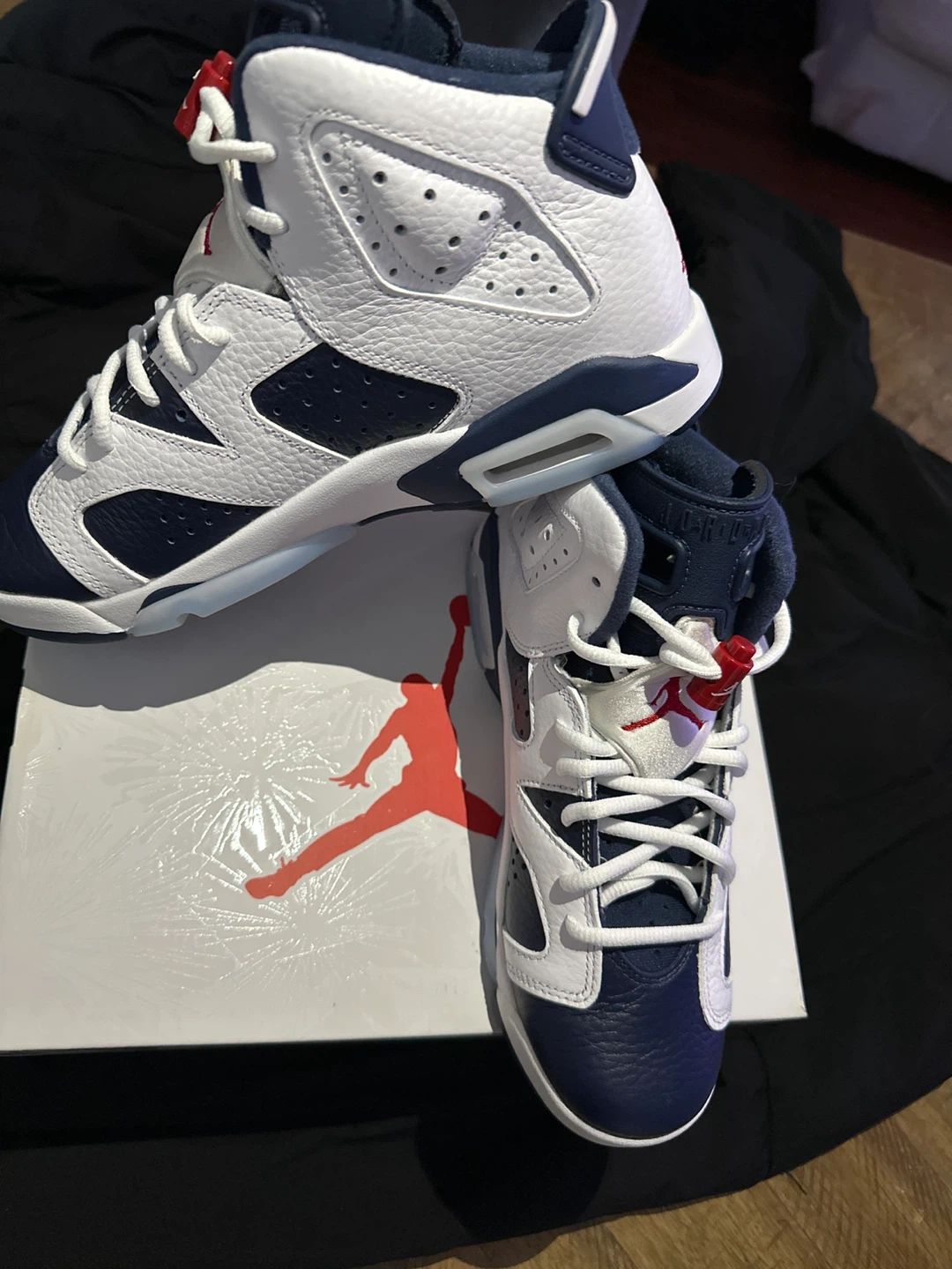 These Air Jordan 6 Retro sneakers come in a "Midnight Navy" colorway. They're crafted with a mix of leather and textile for a comfortable fit. Includes original box and laces.