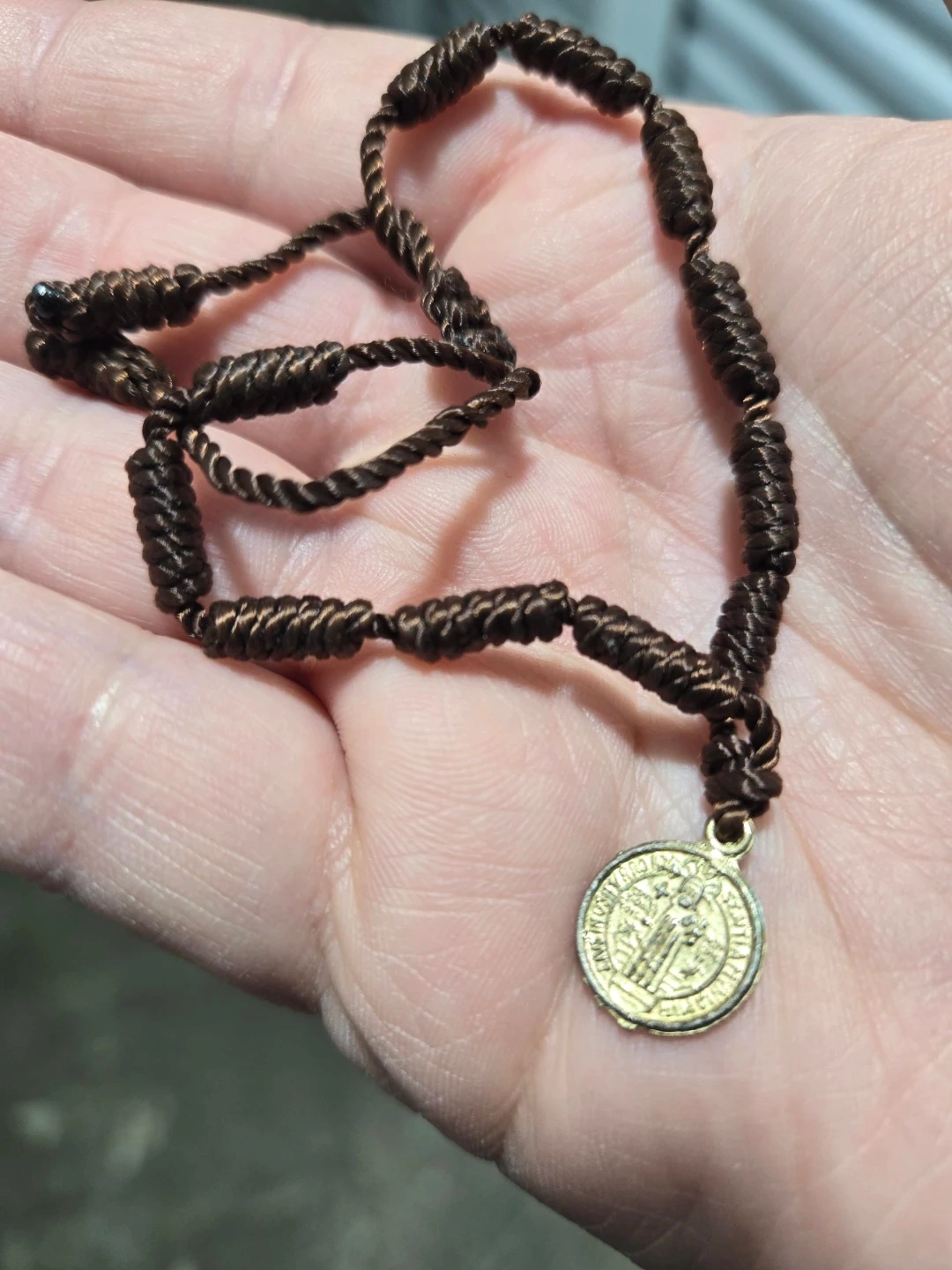 Brown cord rosary bracelet with a St. Benedict medal. It features a macrame knot design along the cord. This is a spiritual item. Has been blessed from the churches of Mexico