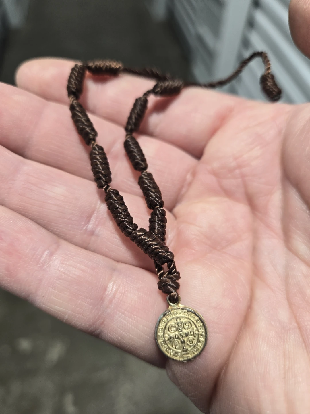 Brown cord rosary bracelet with a St. Benedict medal. It features a macrame knot design along the cord. This is a spiritual item. Has been blessed from the churches of Mexico