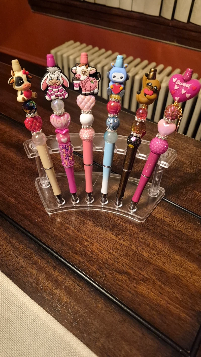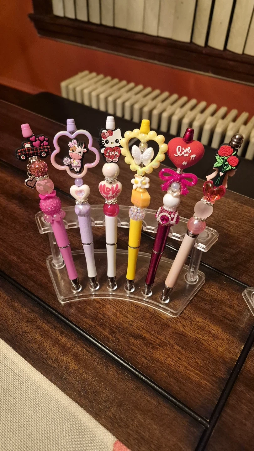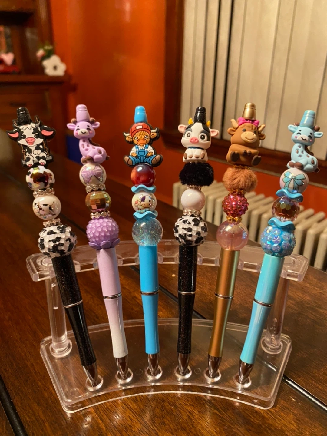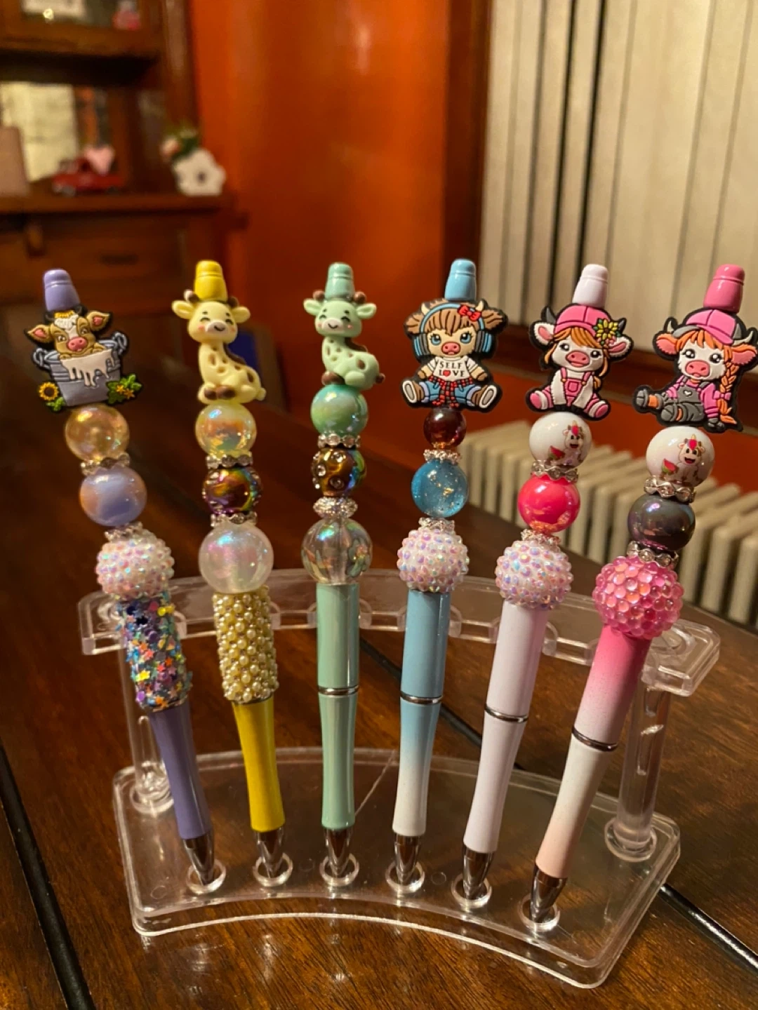 These are unique, decorative pens adorned with colorful beads. Each pen features a fun charm on top, like cows, giraffes, Hello Kitty, or hearts. They're perfect for adding a little flair to your desk or for gifting!