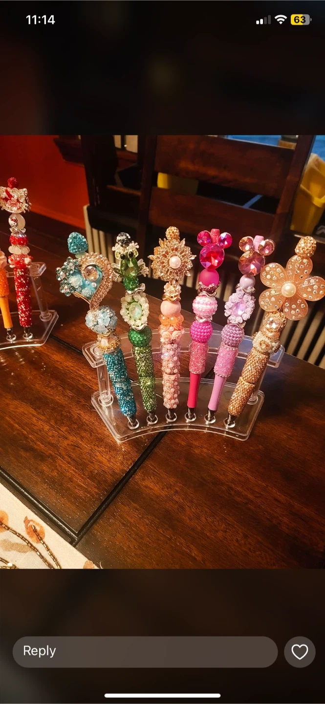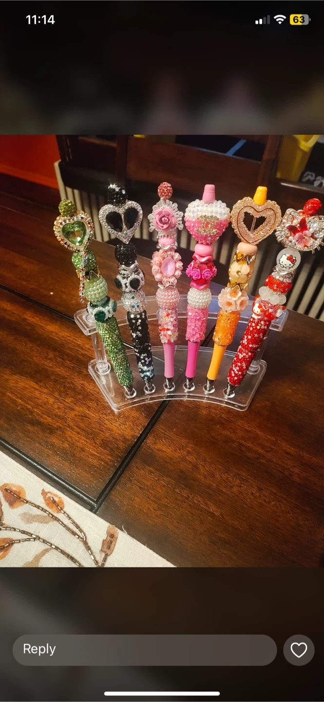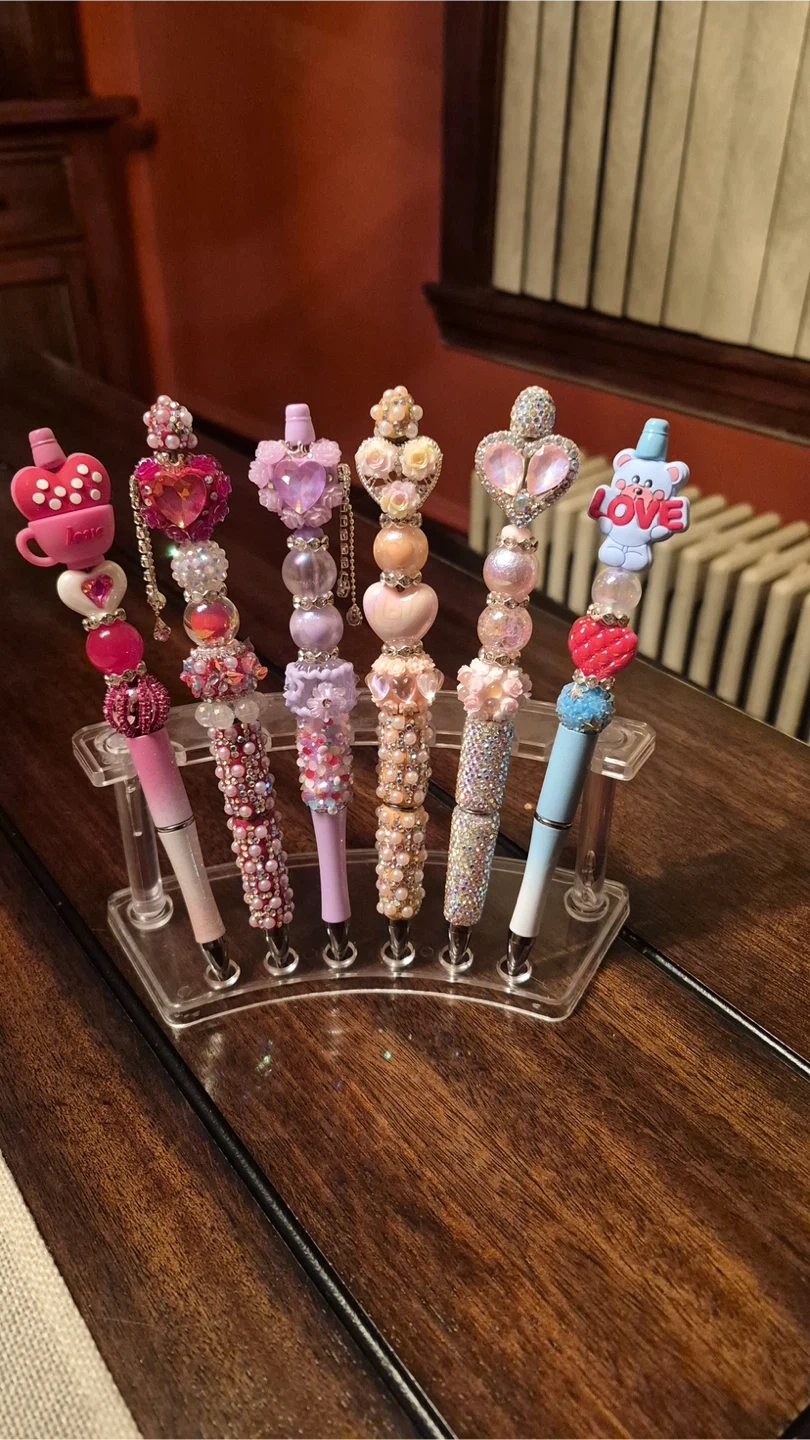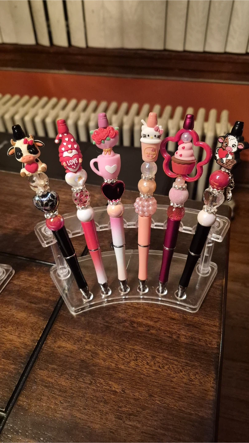 These are unique, decorative pens adorned with colorful beads. Each pen features a fun charm on top, like cows, giraffes, Hello Kitty, or hearts. They're perfect for adding a little flair to your desk or for gifting!