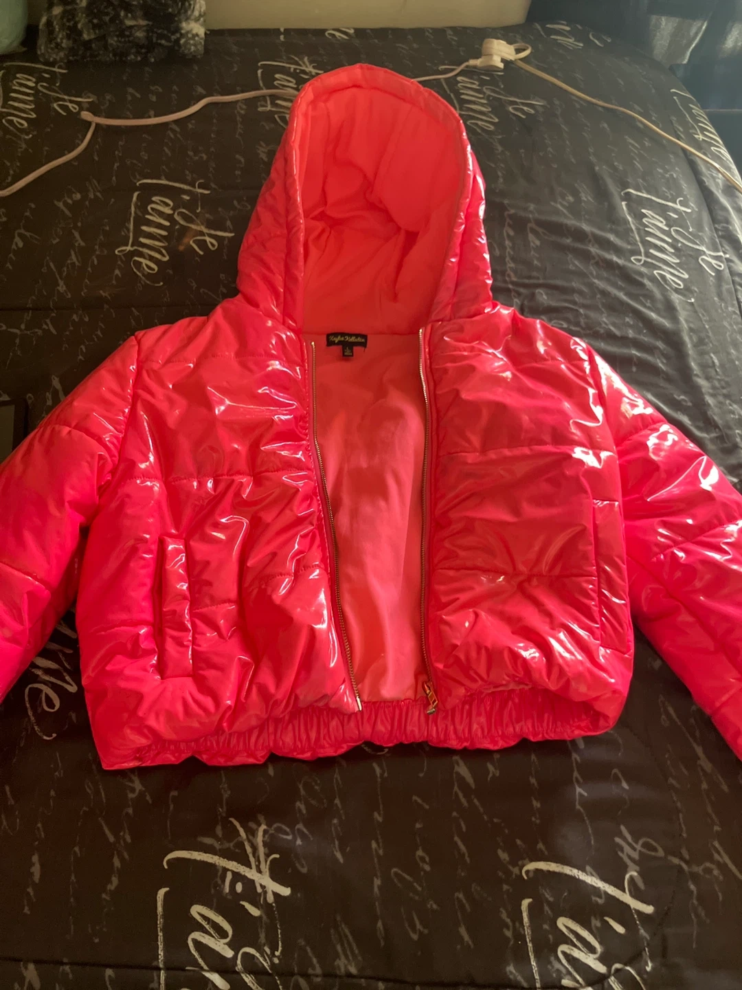 This bright pink puffer jacket has a shiny, vinyl-like finish and a cropped silhouette. It features a hood and elasticized cuffs and hem. It's a stylish piece for colder weather!