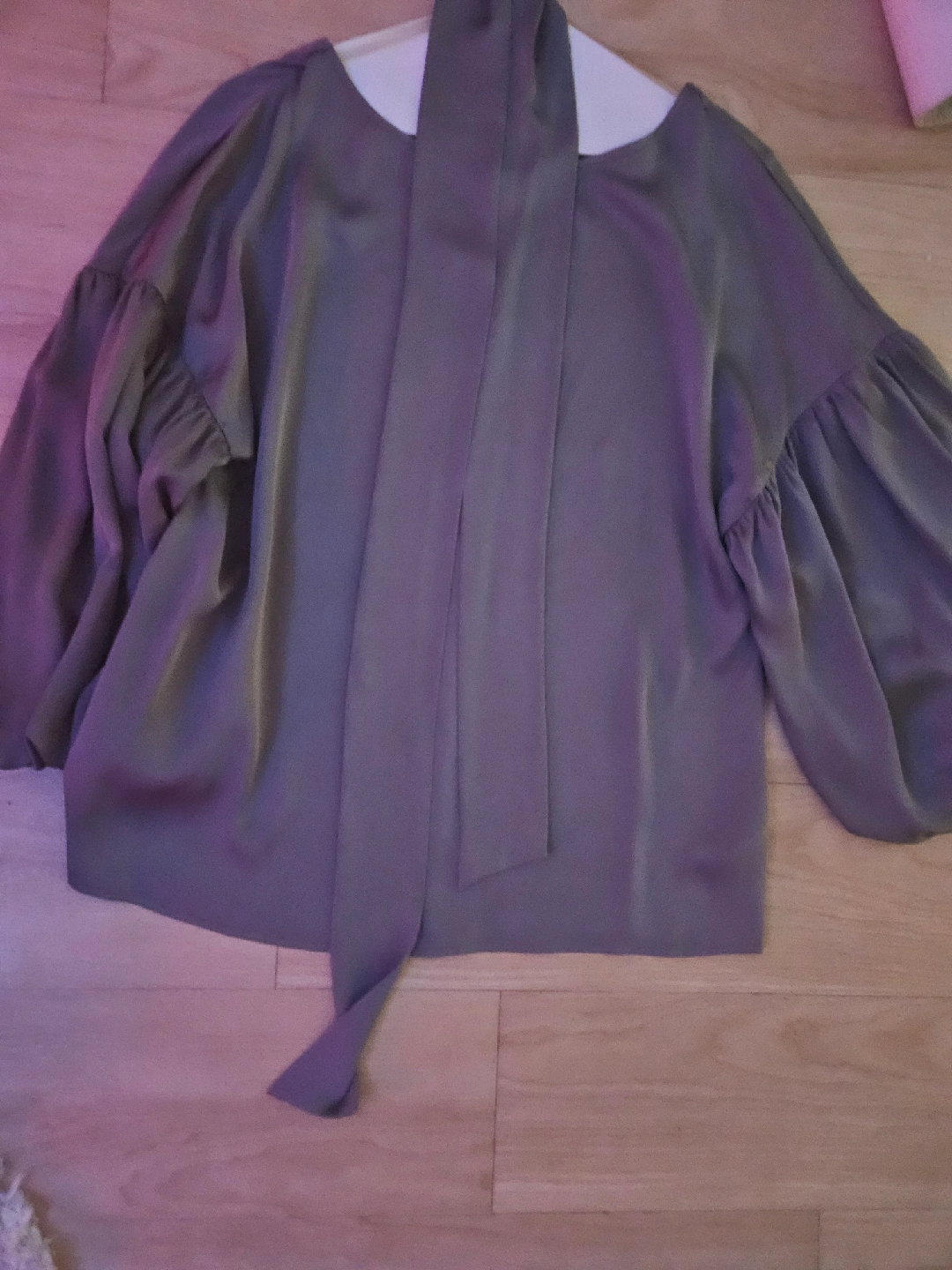 This is a lovely olive green blouse with a tie-neck detail and balloon sleeves. It's in great condition and ready for a new home! The material has a slight sheen, giving it a sophisticated look. Perfect for dressing up or down!