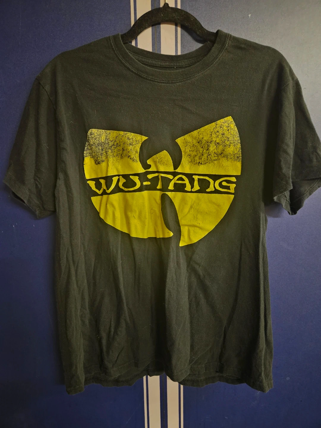Black short-sleeve t-shirt with the iconic Wu-Tang Clan logo and name printed on the front. Cotton material. Comfortable fit for everyday wear.