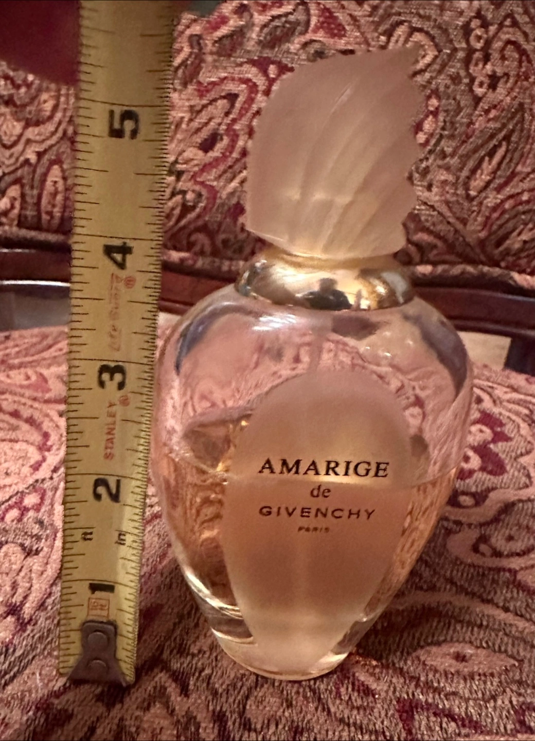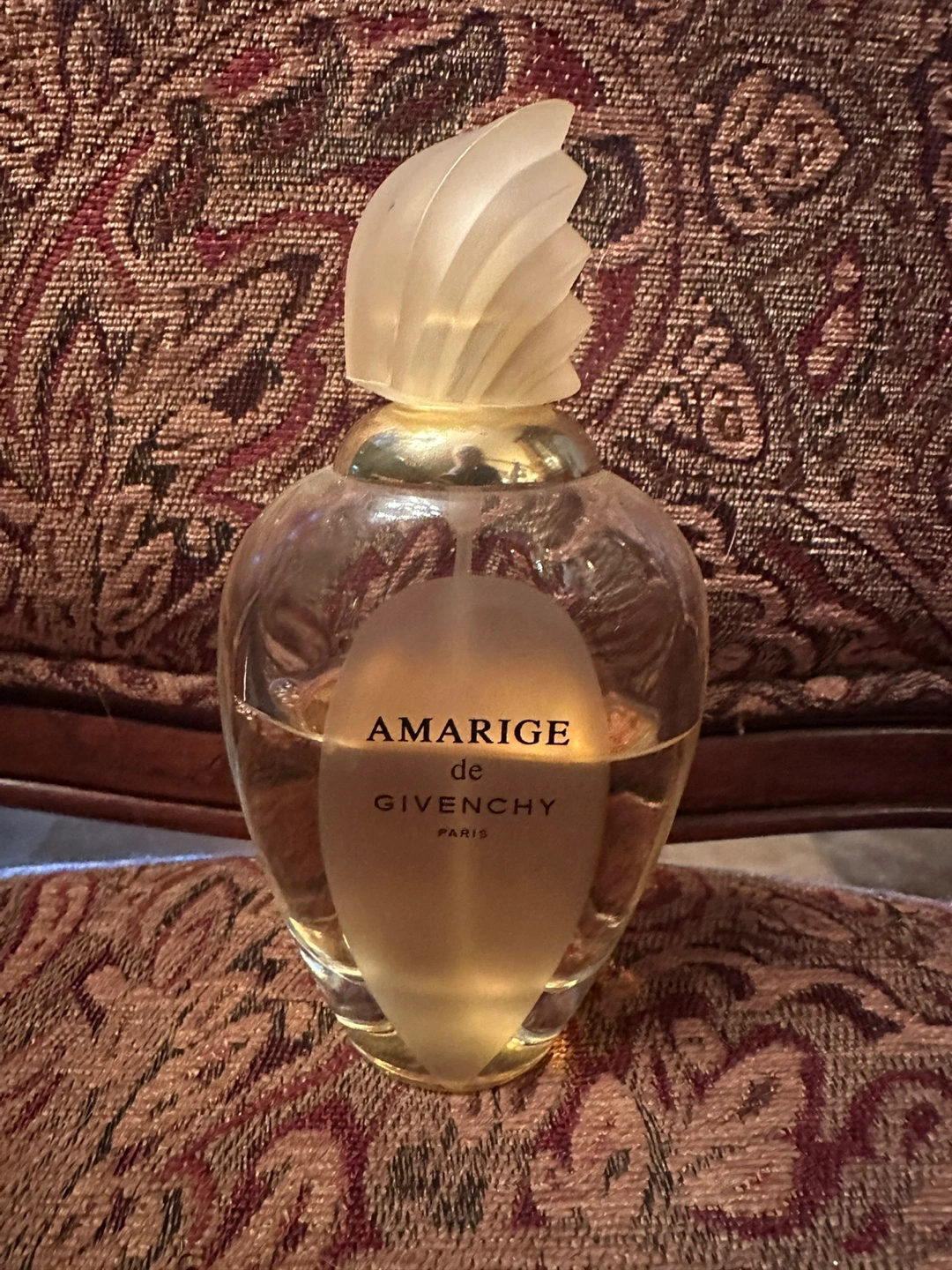 Beautiful vintage perfume bottle. Amarige de Givenchy. Paris. Appears mostly full. Unique frosted glass stopper.