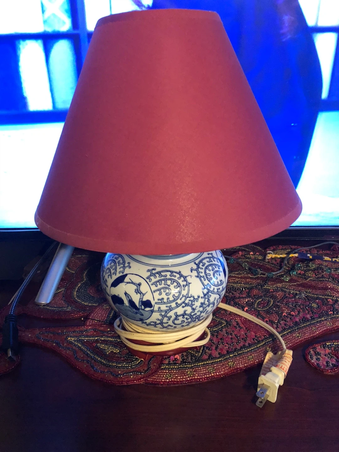 Giving a charming blue and white ceramic table lamp. It features a lovely pattern and a maroon lampshade. Perfect for adding a touch of elegance to any room.