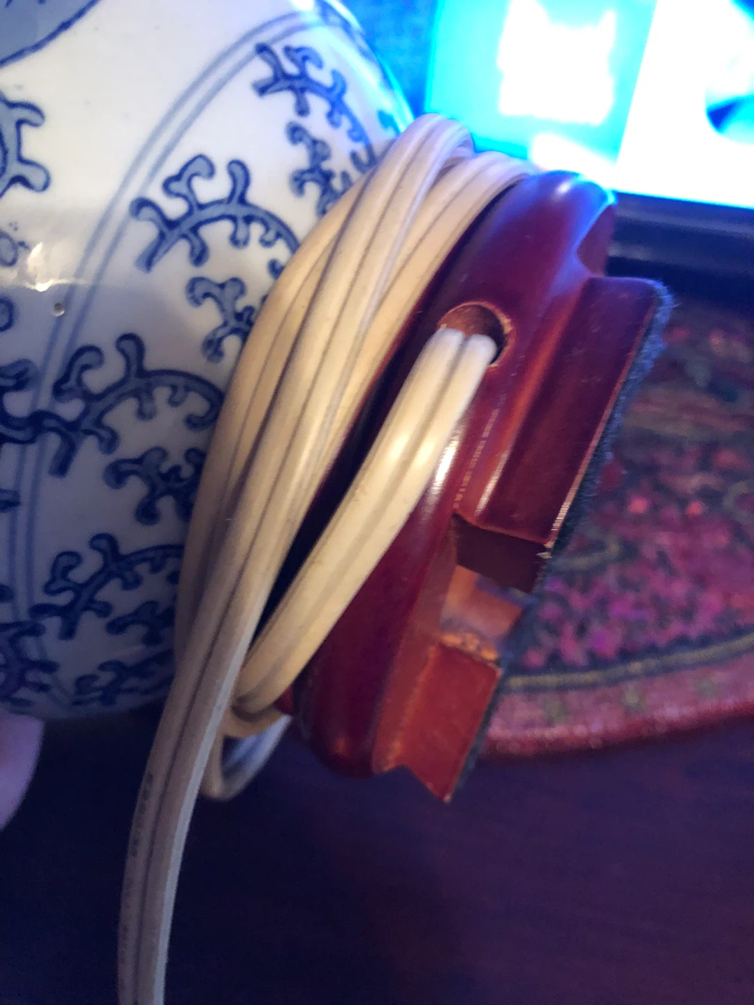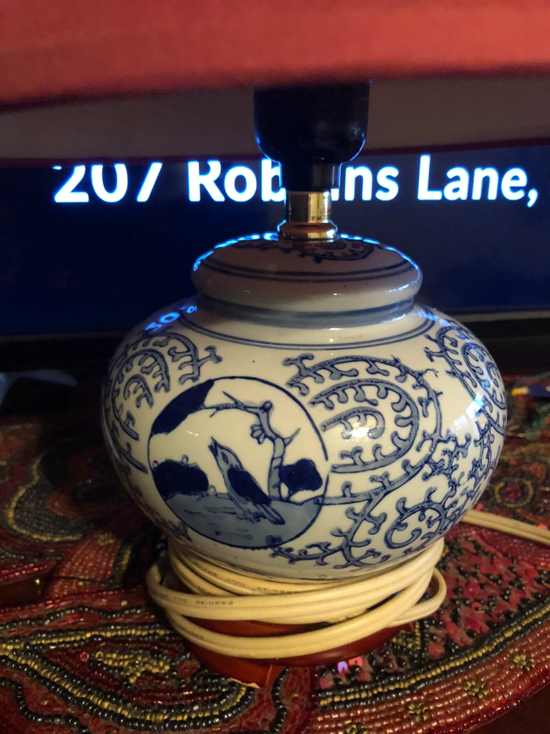 Giving a charming blue and white ceramic table lamp. It features a lovely pattern and a maroon lampshade. Perfect for adding a touch of elegance to any room.
