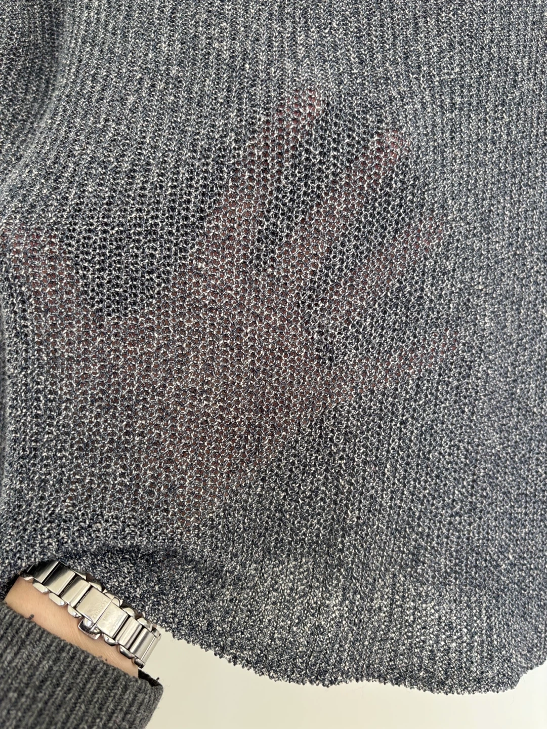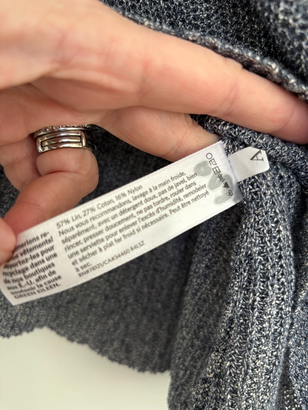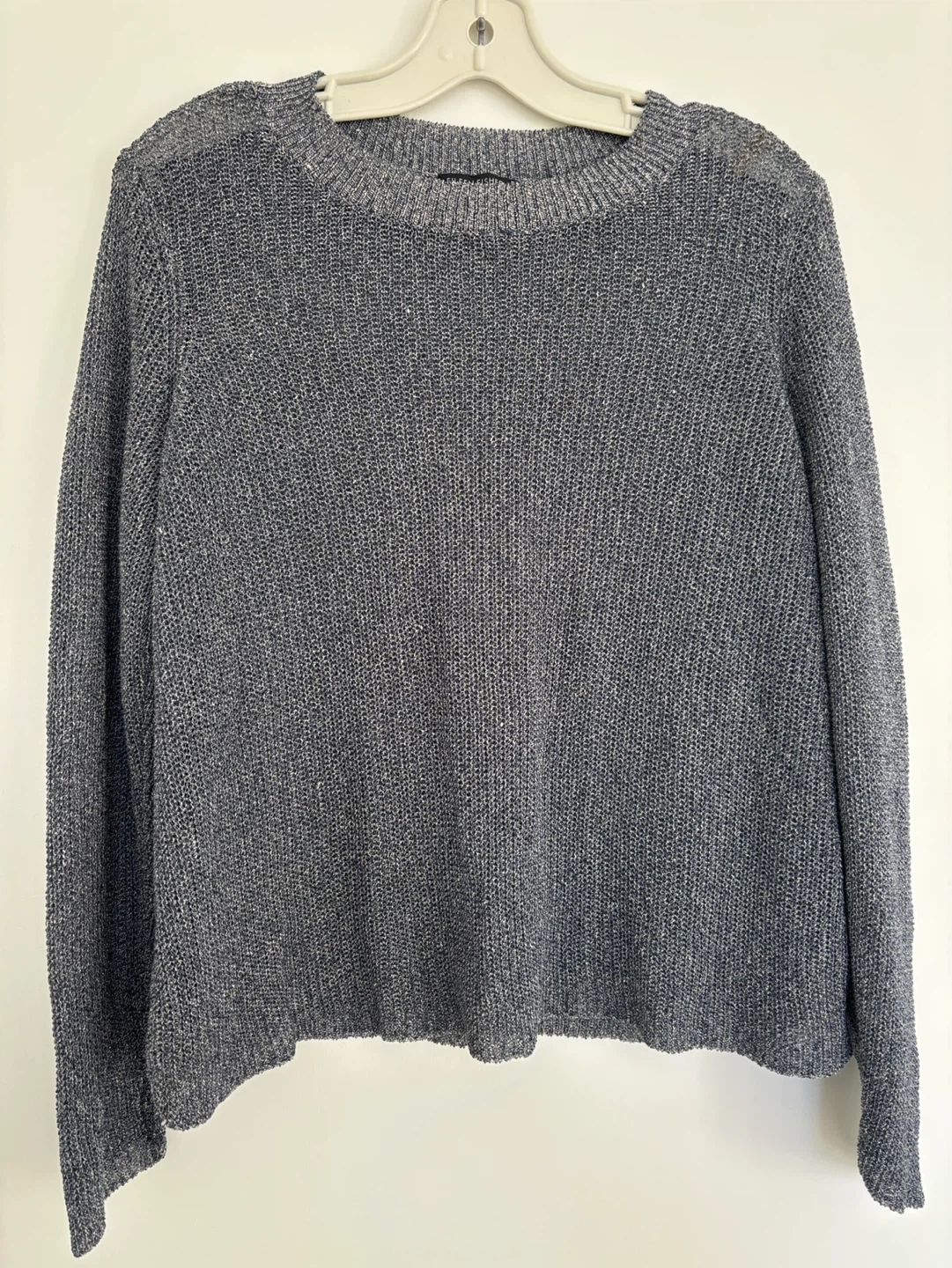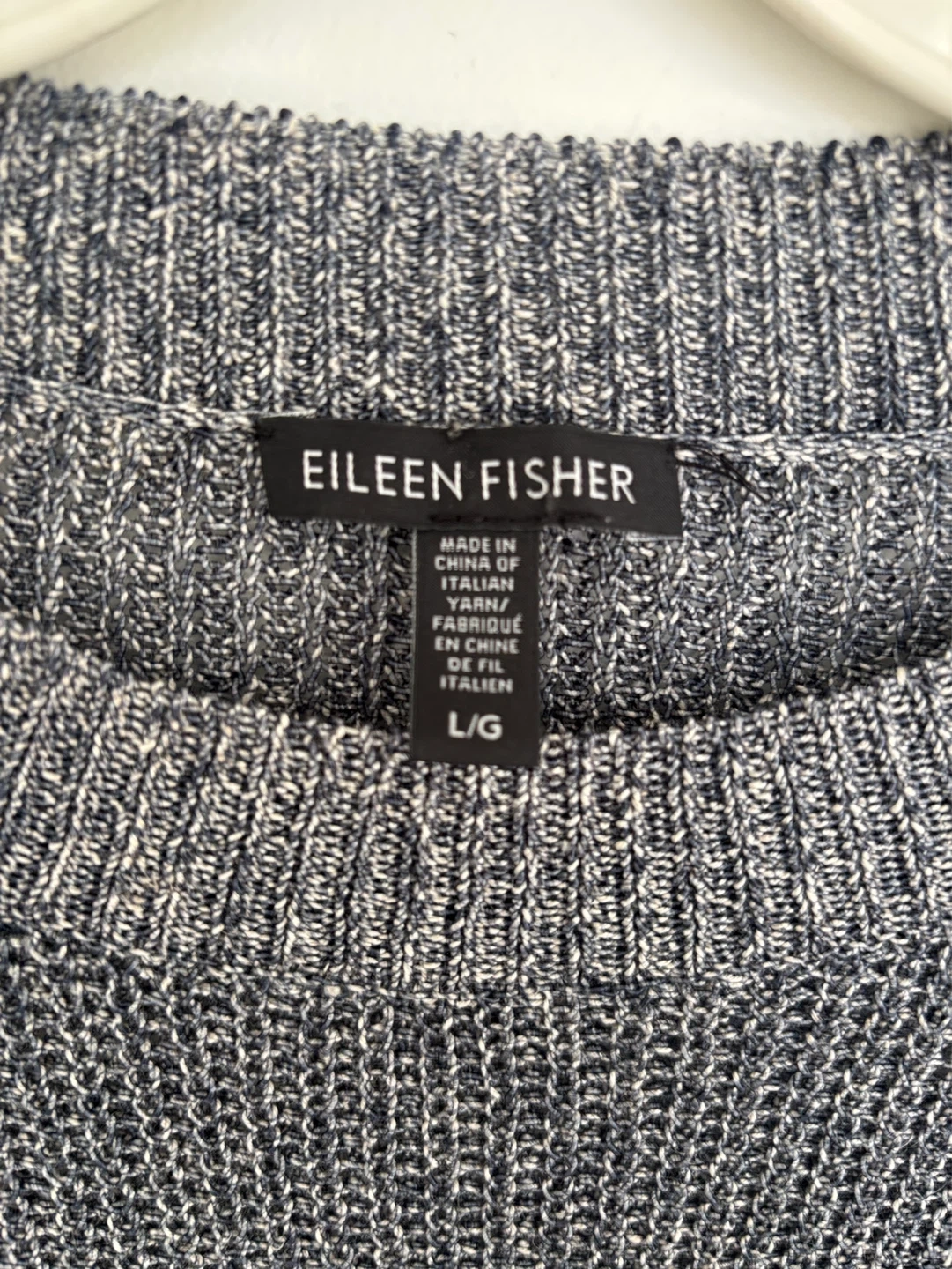 This Eileen Fisher sweater is size large. It's made of 57% linen, 27% cotton, and 16% nylon. The knit fabric is lightweight and breathable.