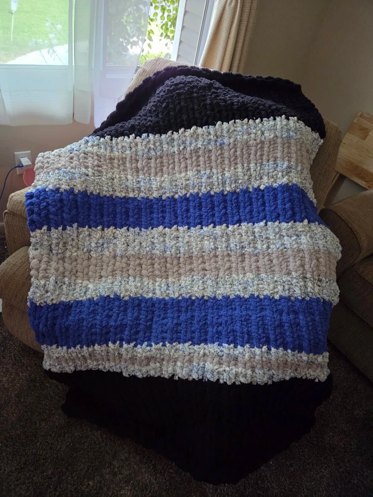 Selling a cozy, handmade chunky knit blanket! It features stripes in blue, gray, and black. Perfect for adding a warm touch to your home!