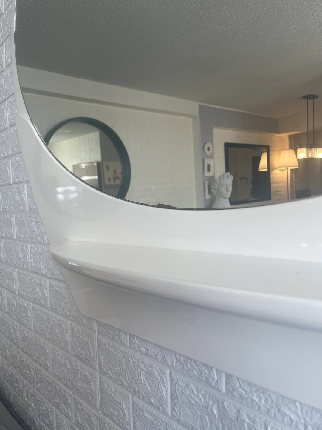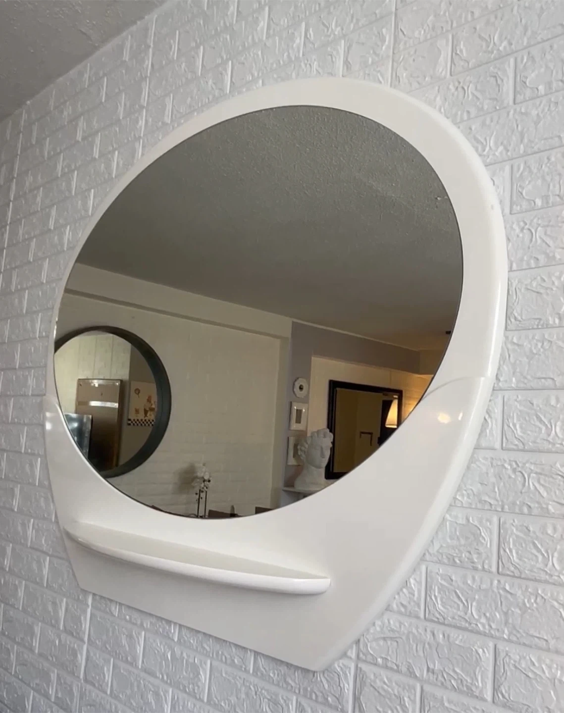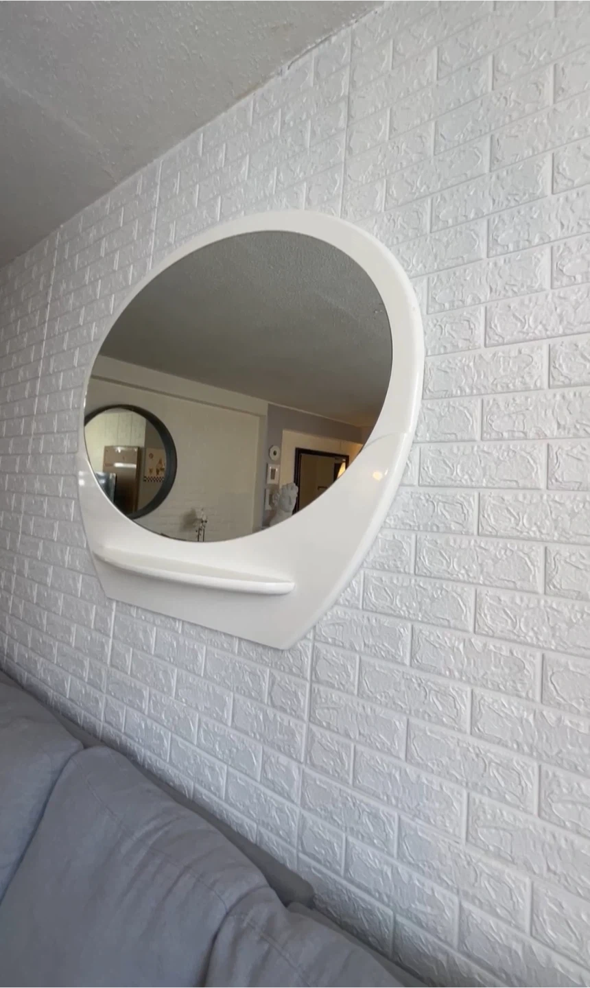 Oval wall mirror with a small built-in shelf. It's white and has a unique modern design. Perfect for entryways or big spaces!