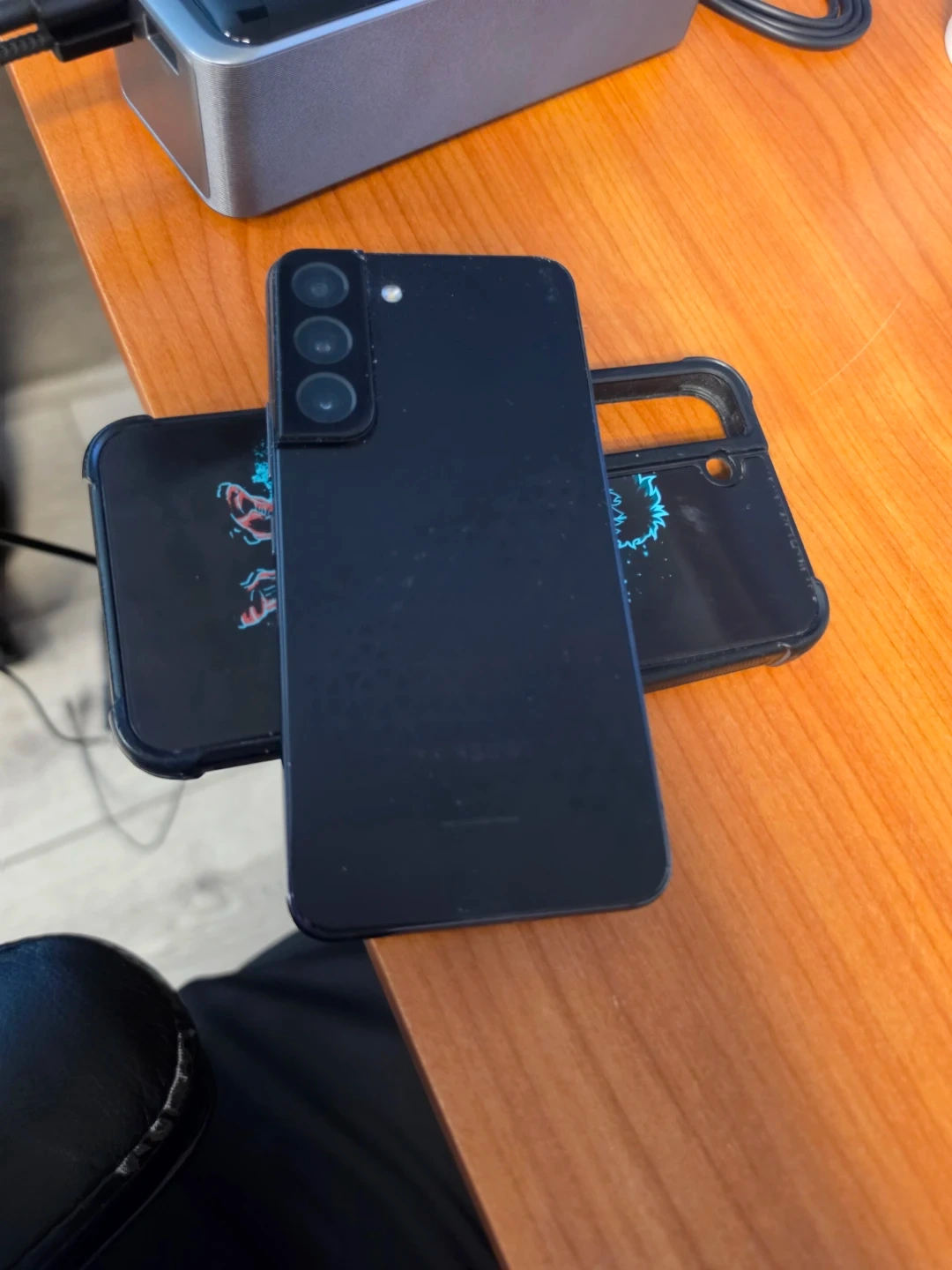 Black Samsung Galaxy S22 smartphone. It's in good working condition. Includes a protective case.