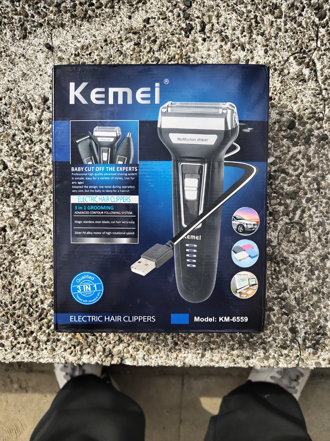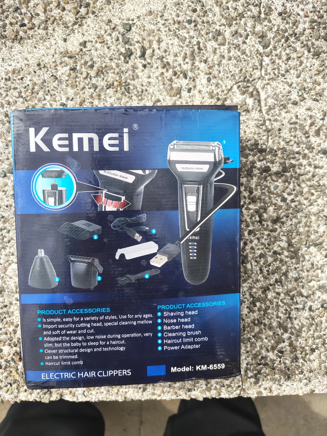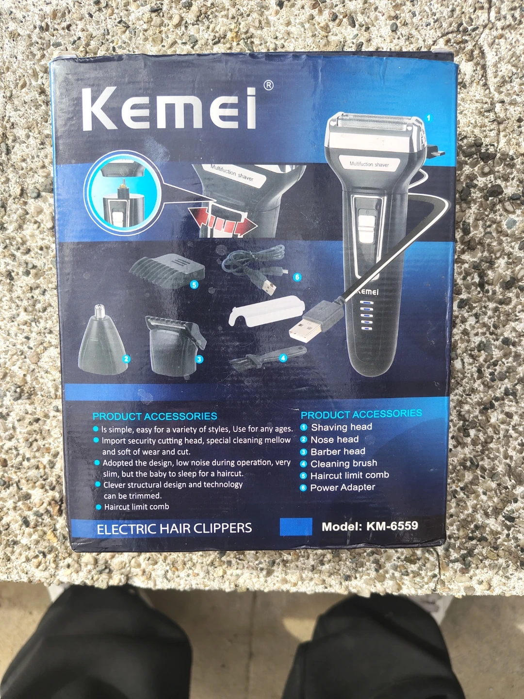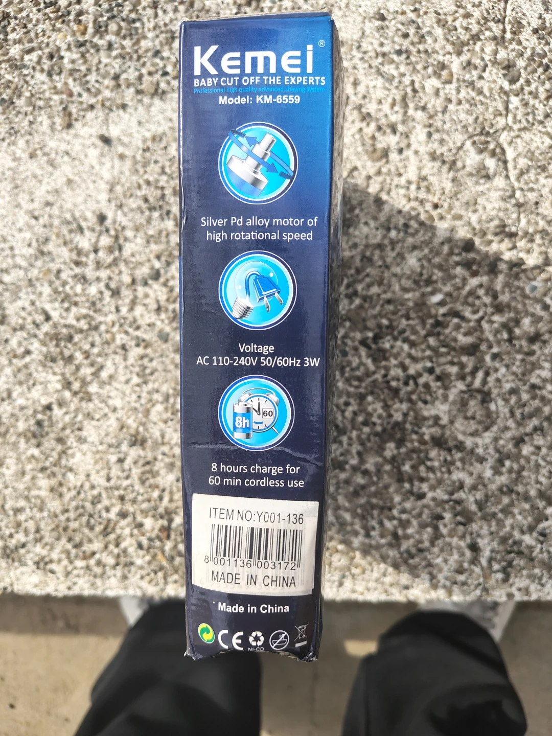 This is a Kemei electric hair clipper, model KM-6559. It features a silver Pd alloy motor for high rotational speed. It comes with a shaving head, nose head, barber head, cleaning brush, haircut limit comb, and power adapter. The device requires 8 hours to charge for 60 minutes of cordless use.