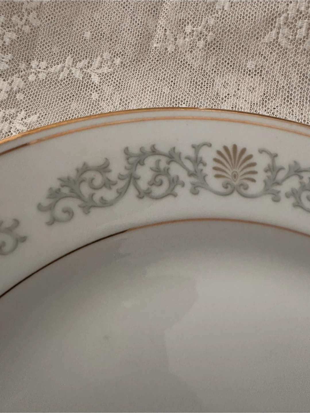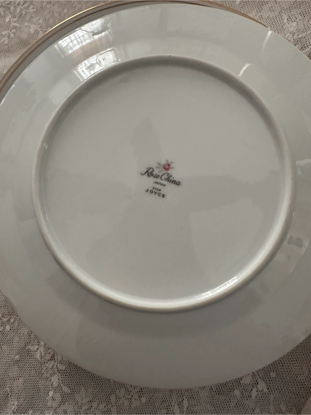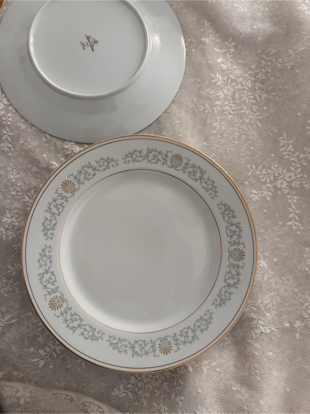 This is a Rose China "Joyce" pattern plate made in Japan. It features a delicate gold rim and a gray scroll design. It's perfect for adding a touch of elegance to your table setting. Measures approximately 10.5 inches in diameter. I have 6