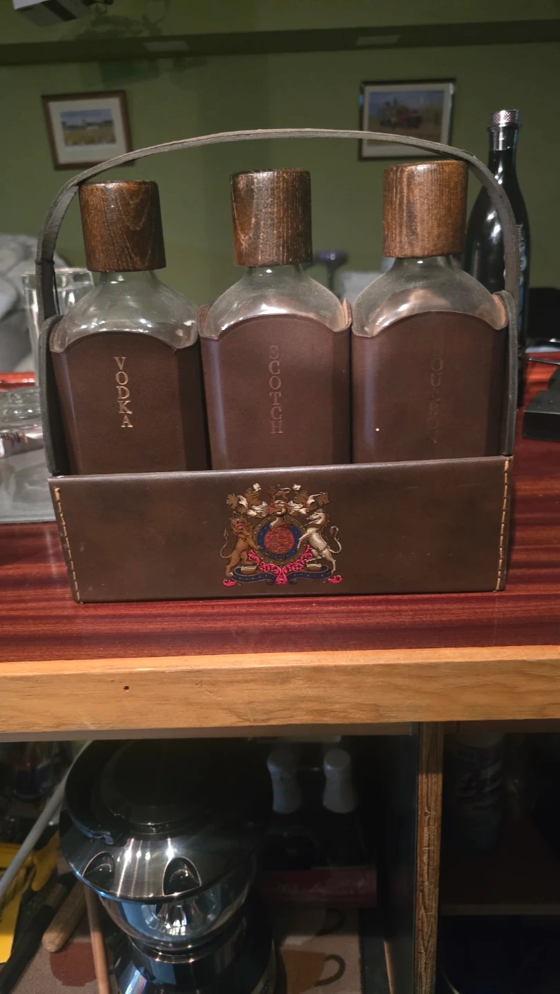 Selling a Kraftware Creations barware set, featuring bottles labeled Vodka, Scotch, and Bourbon. This set is made in the USA and includes a convenient carrying case. Perfect for your home bar or as a unique gift!