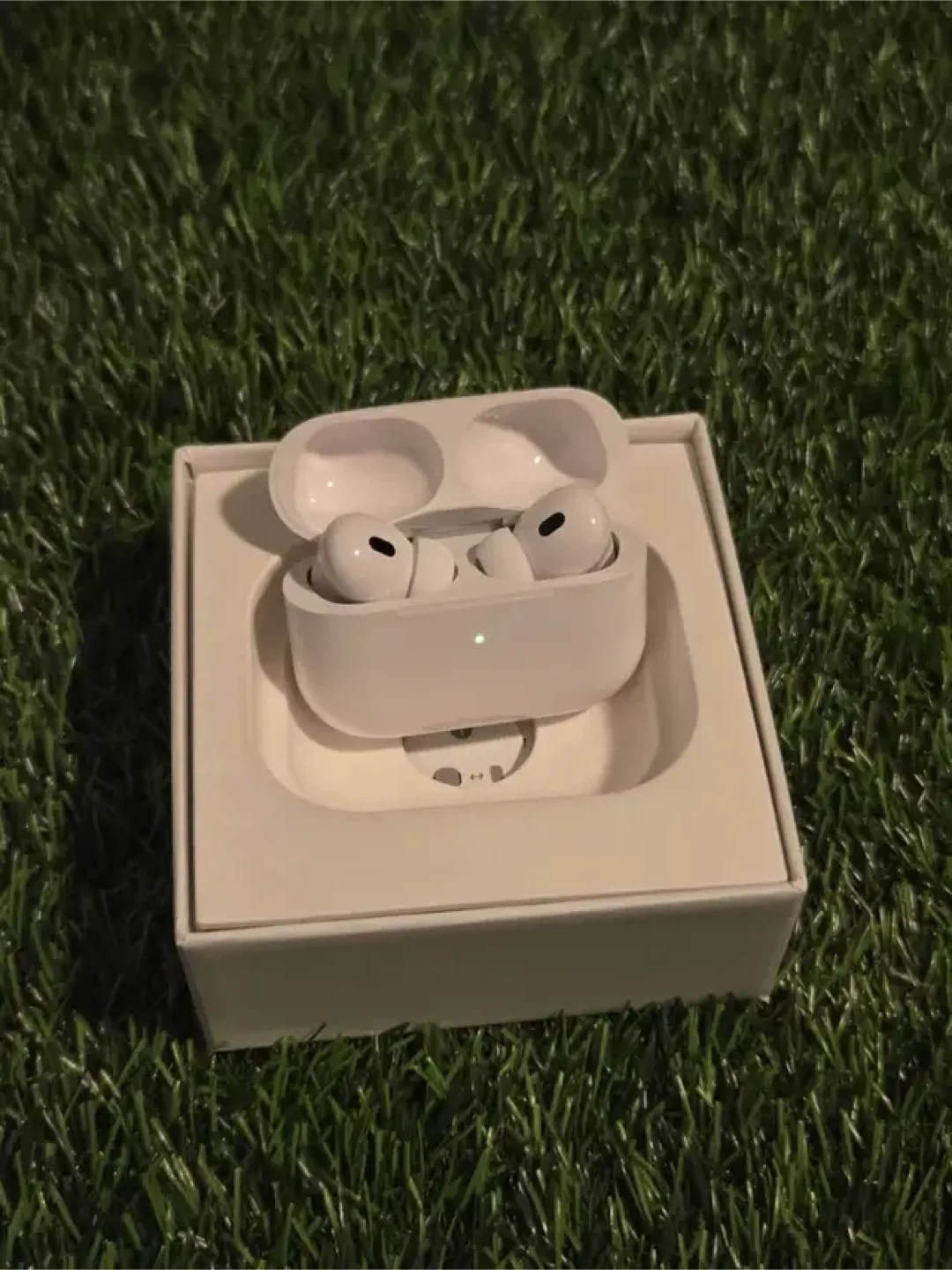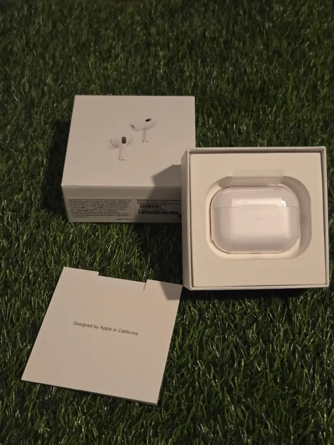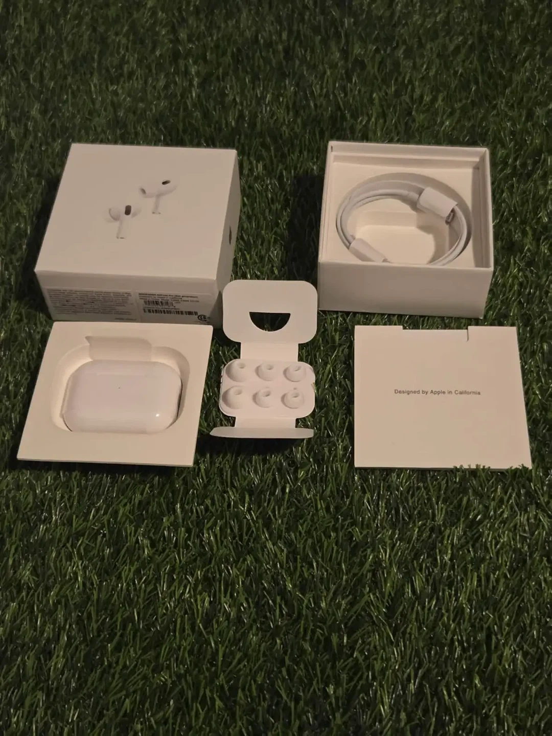 Apple AirPods Pro (2nd generation). Includes charging case and USB-C charging cable. Also comes with extra ear tips. Designed by Apple in California.