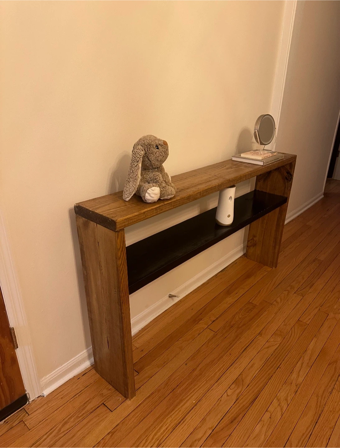 A handcrafted console table that pairs warm wood tones with a matte-black structural element. Designed in a minimal, clean-lined silhouette, it brings grounded simplicity and contemporary presence to entryways and living spaces.