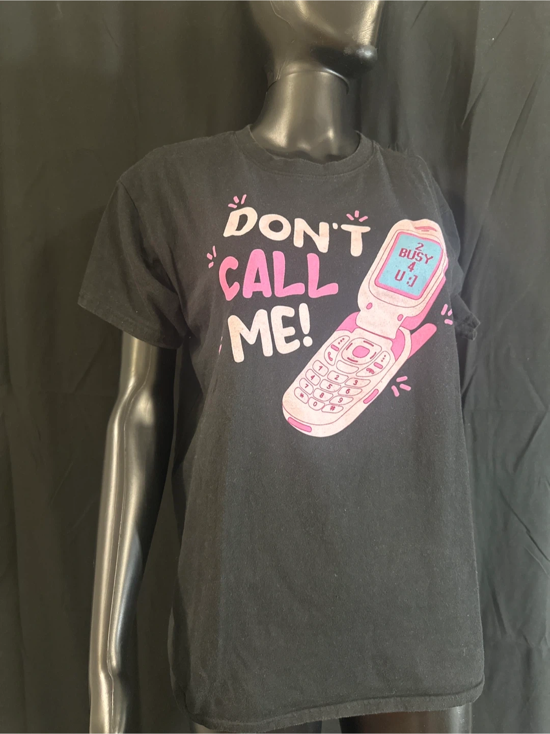 Black t-shirt with a graphic print. It says "Don't Call Me!" with a flip phone image that reads "2 Busy 4 U". Cotton material.