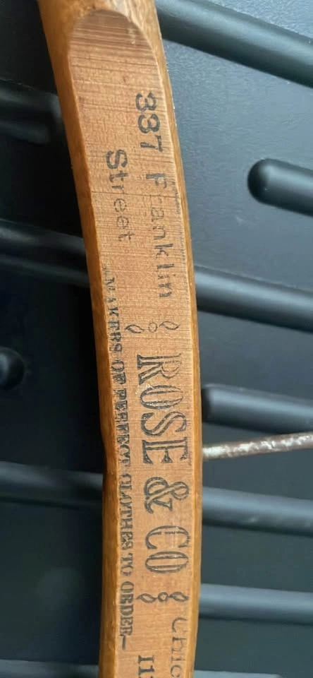 I have a vintage wooden hanger from Rose & Co. that was located at 337 Franklin St. in Chicago. We are guessing it’s some time around the 1920s but I have no way to prove that. Let me know if you have any questions, it can be picked up at Wellington and Seminary