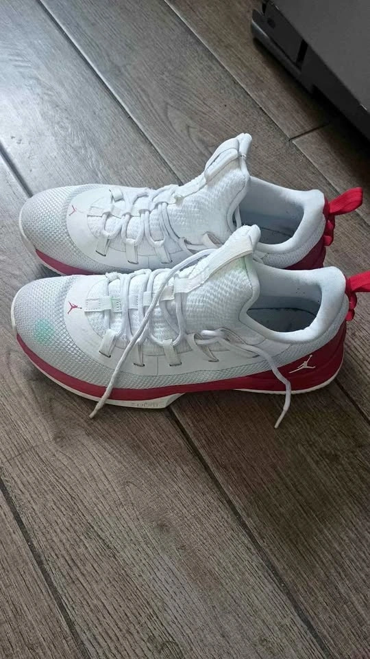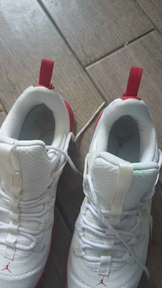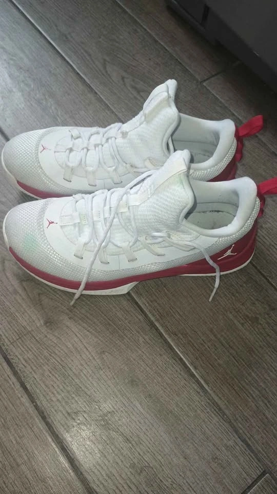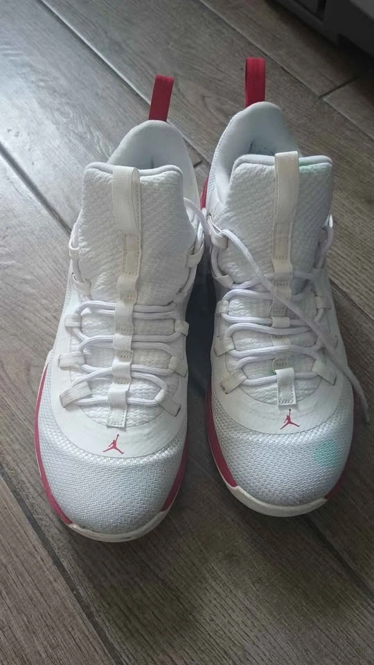 Men's Air Jordan Ultra.Fly 2 Low basketball shoes in White/Gym Red, size 9.5. These stylish and comfortable shoes feature a mesh upper for breathability and support, perfect for performance on the court.