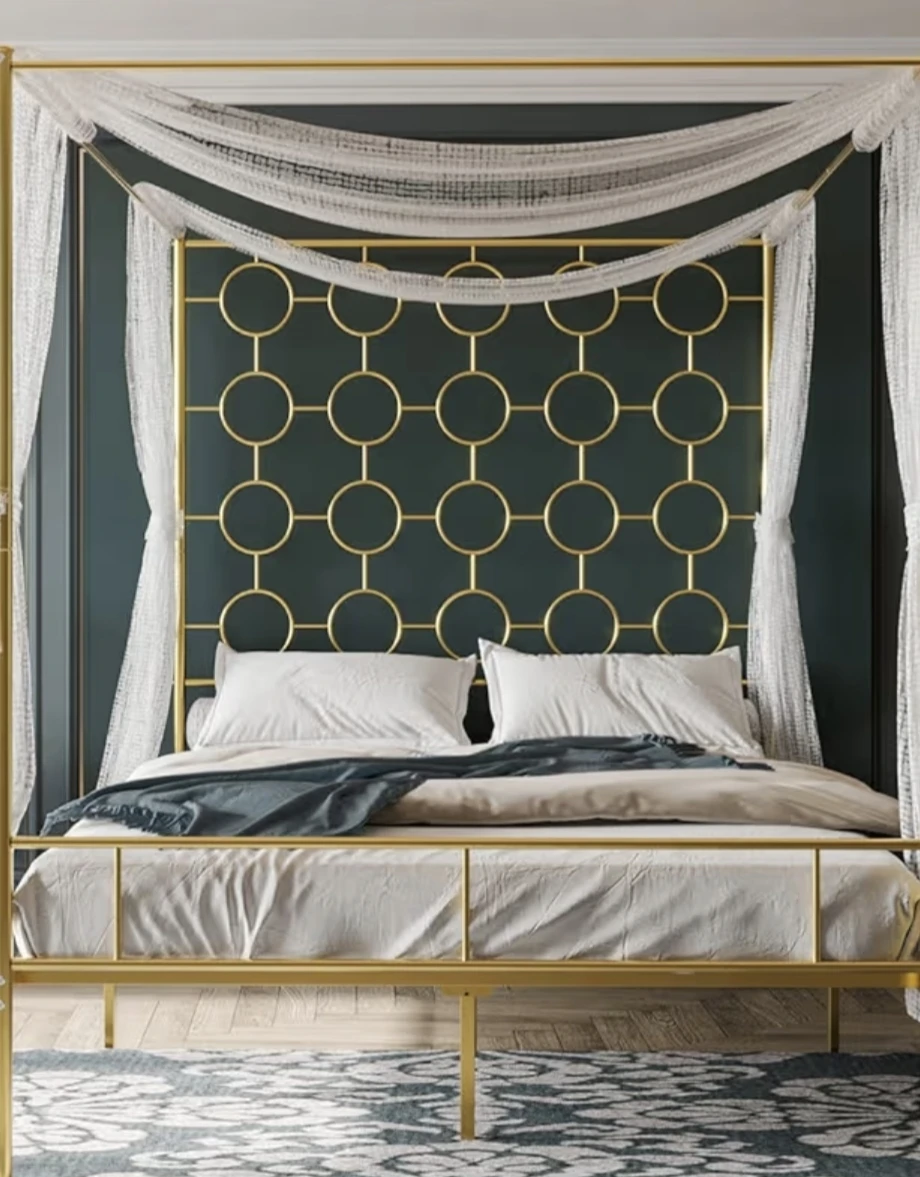 Gold Metal Canopy Bed Frame with Decorative Headboard