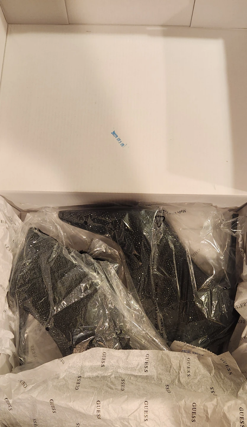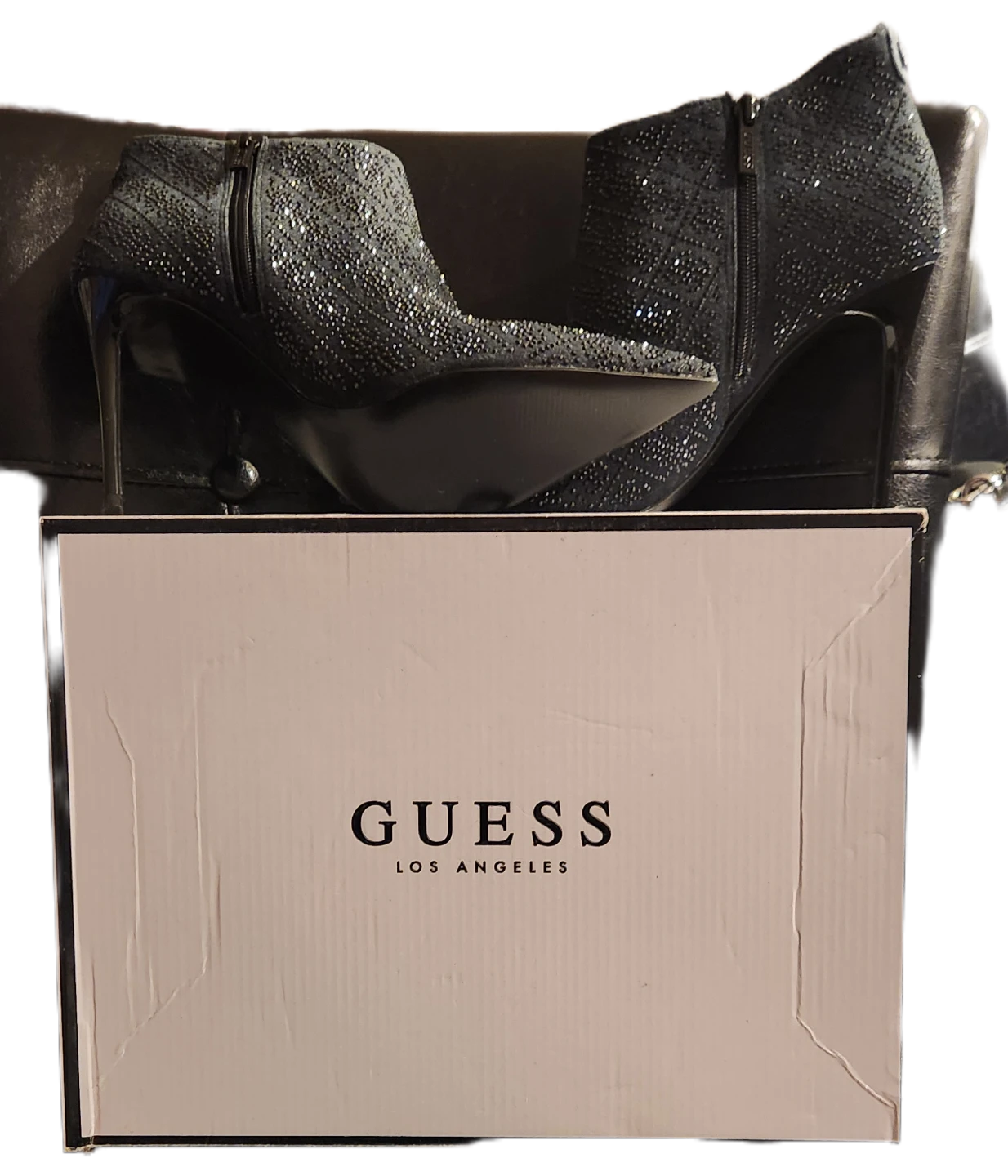 These Guess ankle boots feature a black glittery design. They have a side zipper closure and a pointed toe. Comes with the original box.