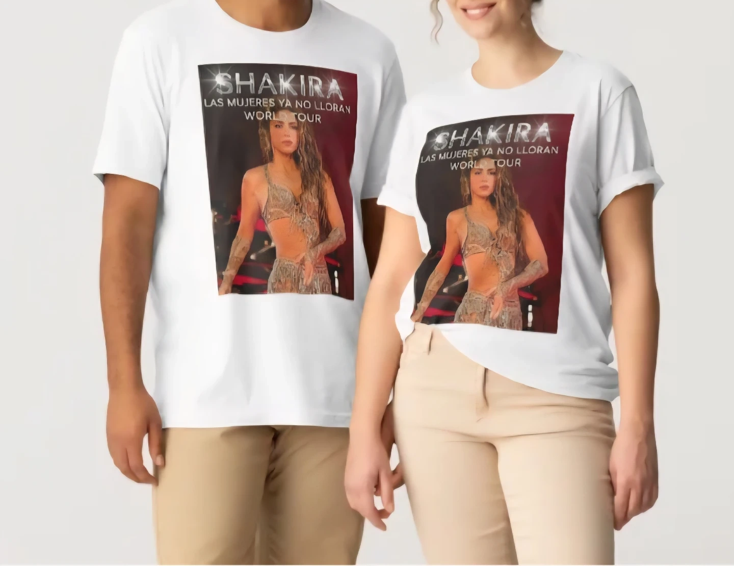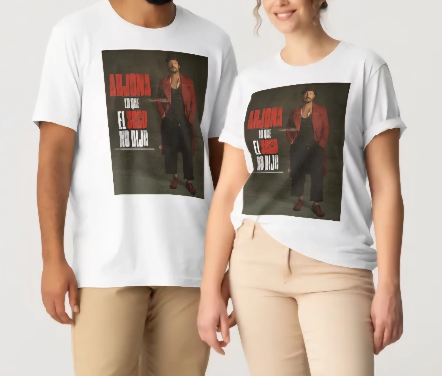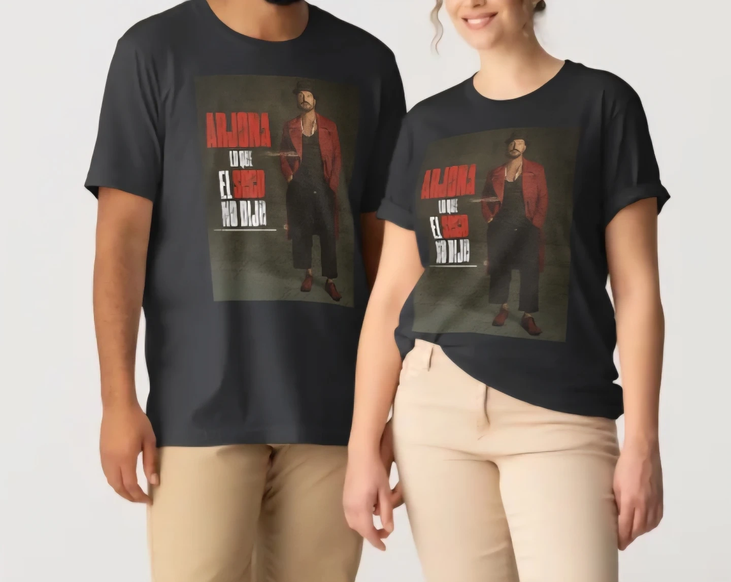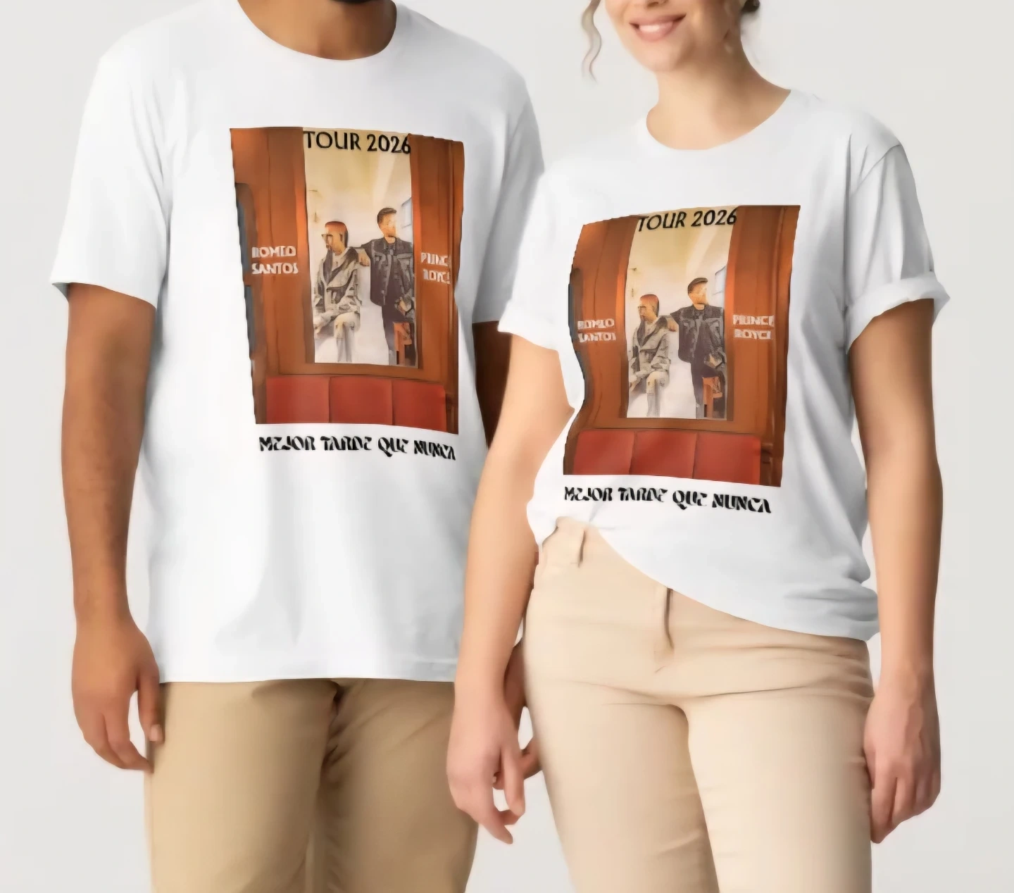 This listing features t-shirts with tour artwork for Arjona, Cazzu, and Romeo Santos & Prince Royce, all for Tour 2026. Available in white and black. 100% cotton fabric.
