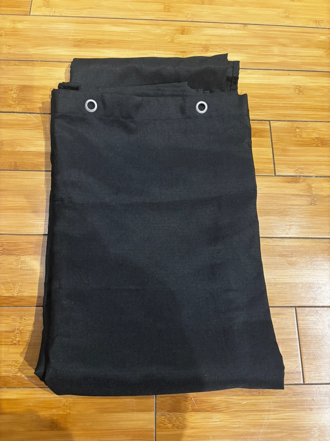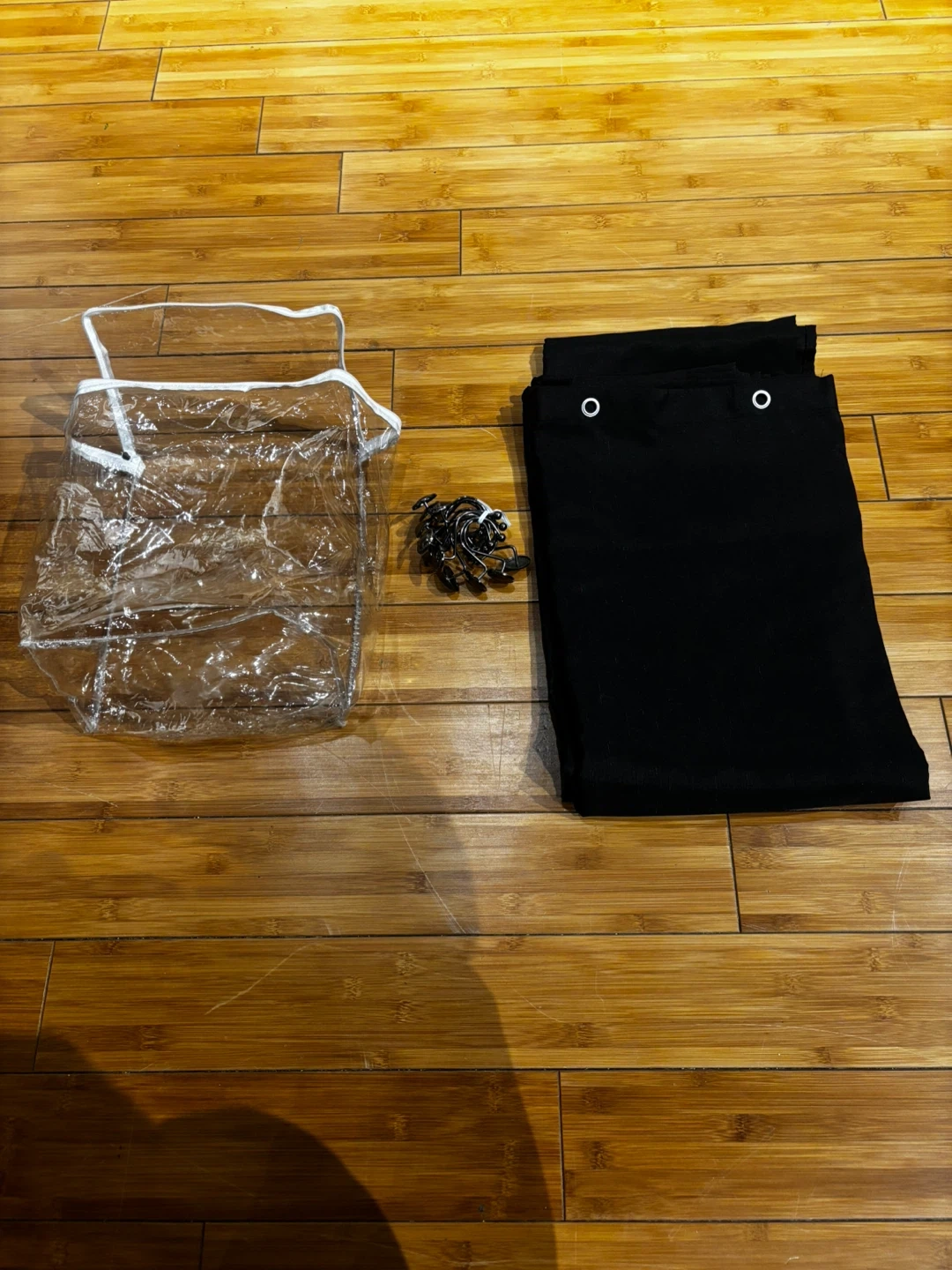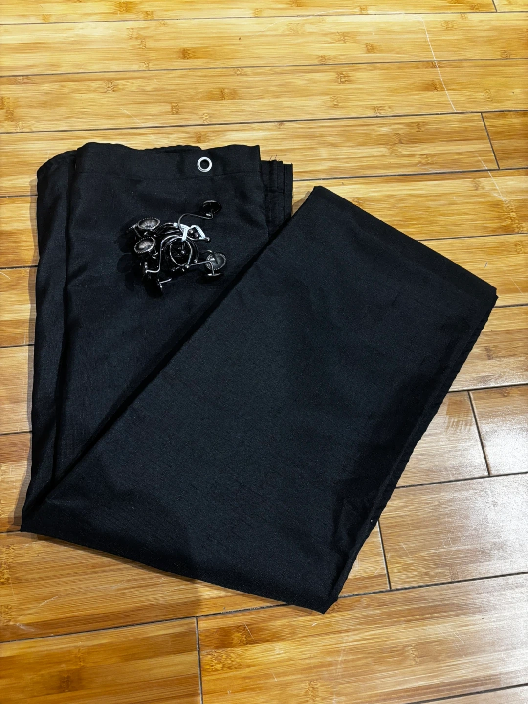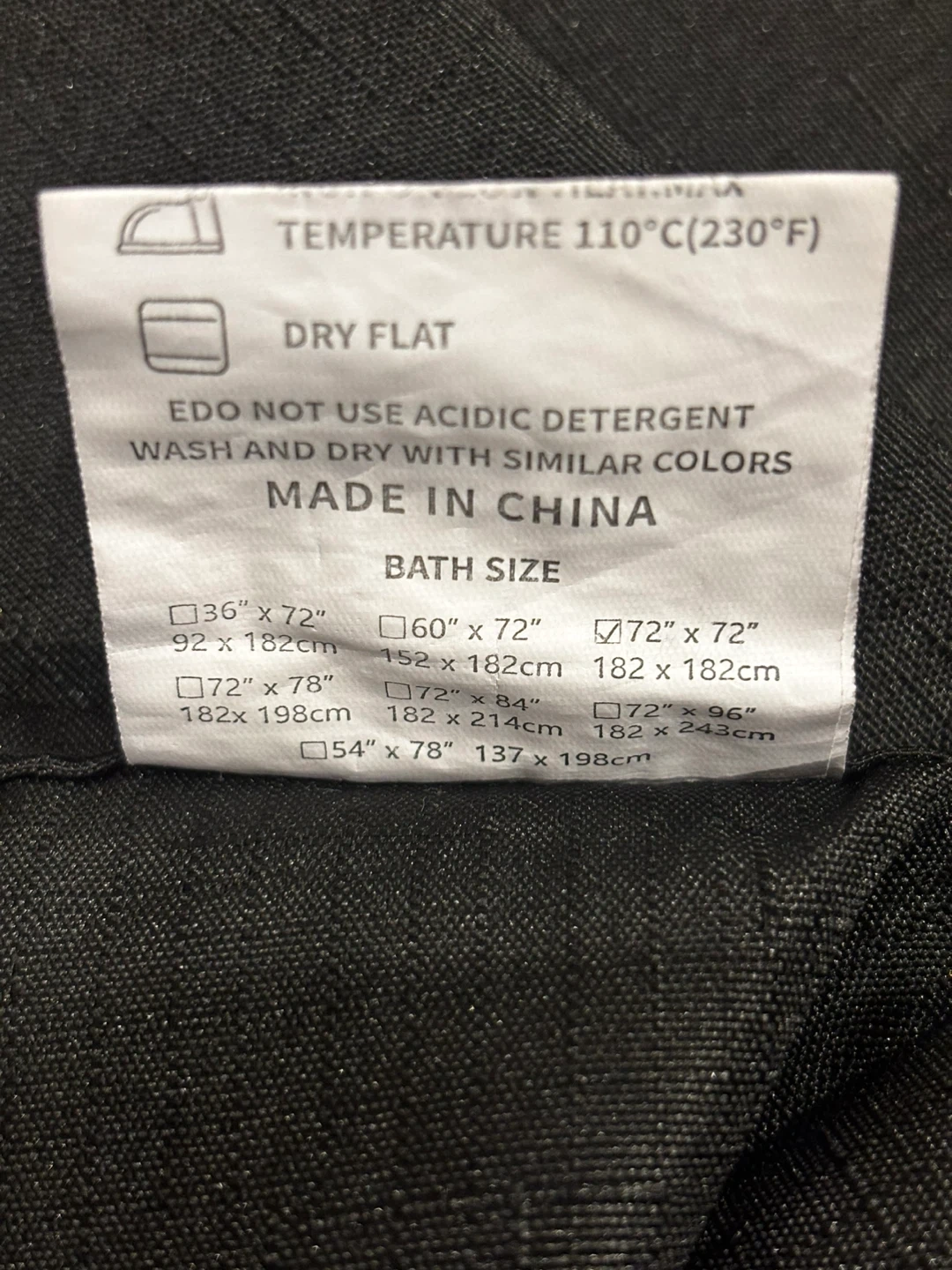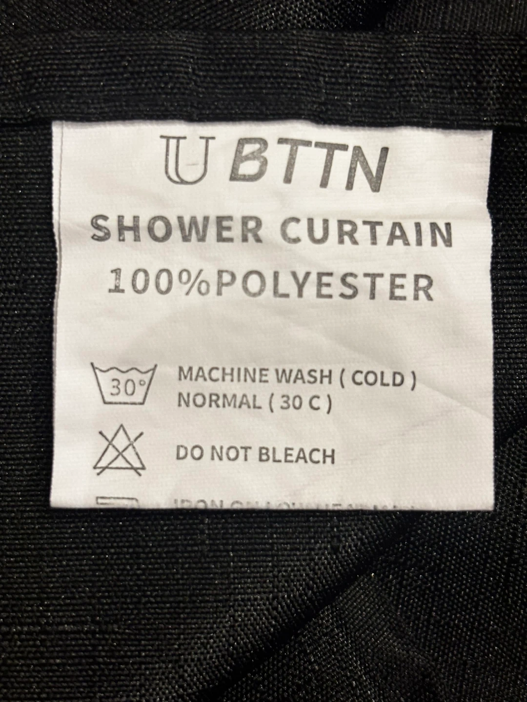 This is a U BTTN shower curtain made of 100% polyester. It comes with a set of metal hooks. It's machine washable cold and should not be bleached. The curtain is black and includes the original clear zipper bag. 72”-72 ”.