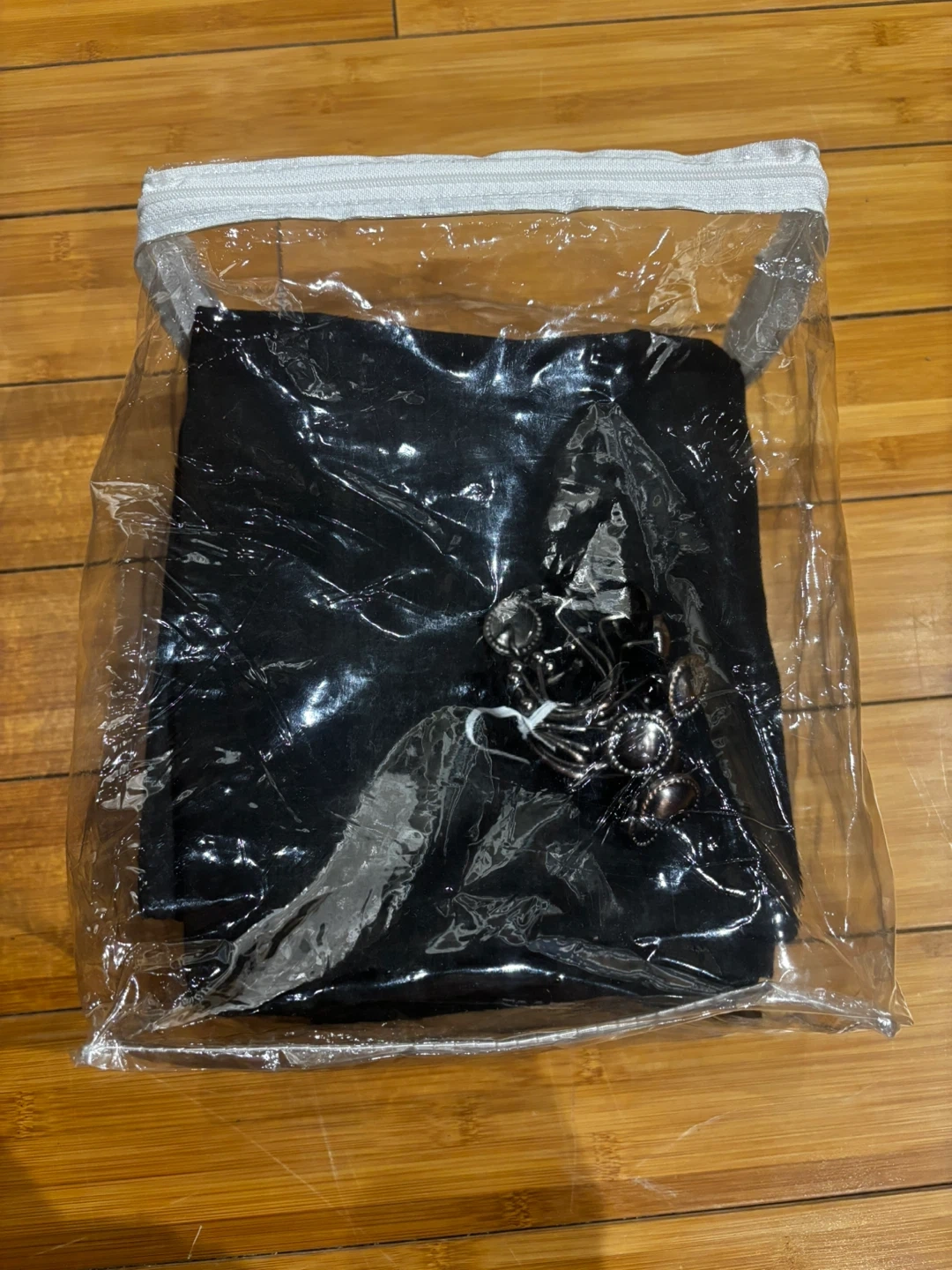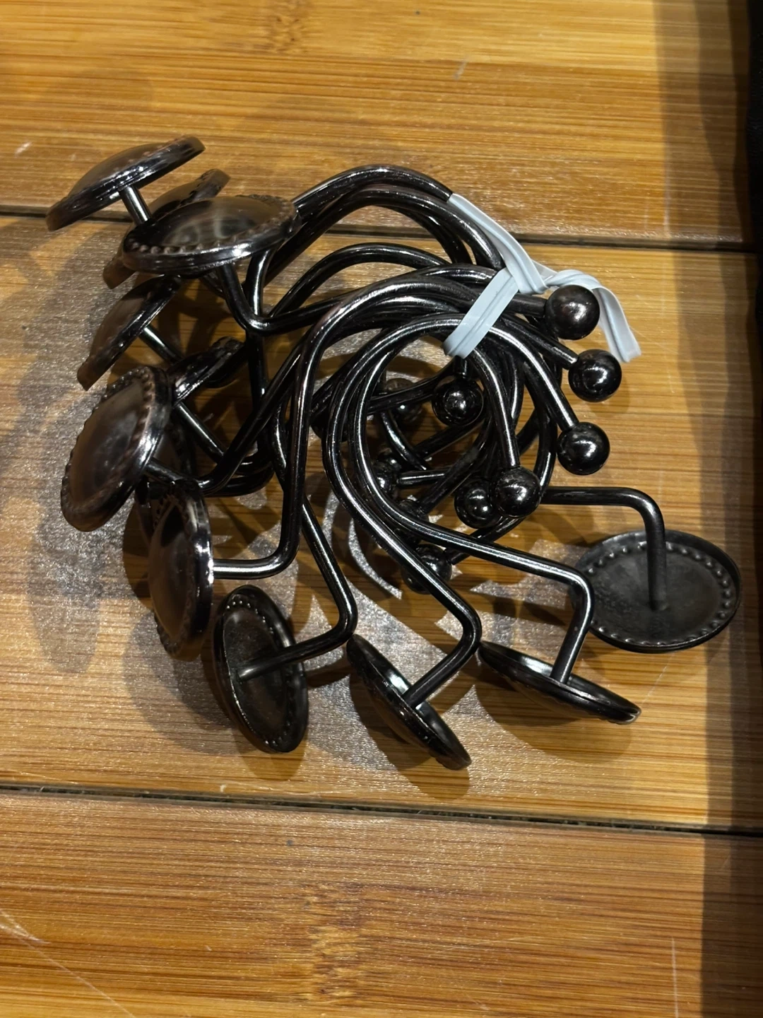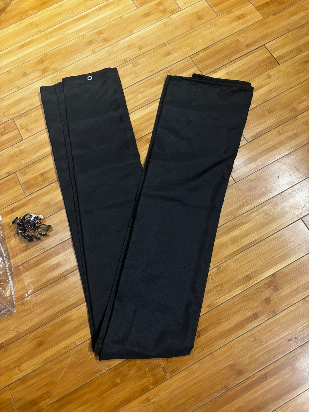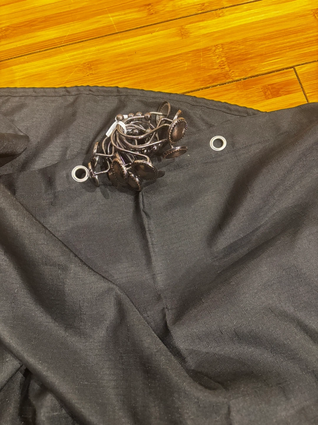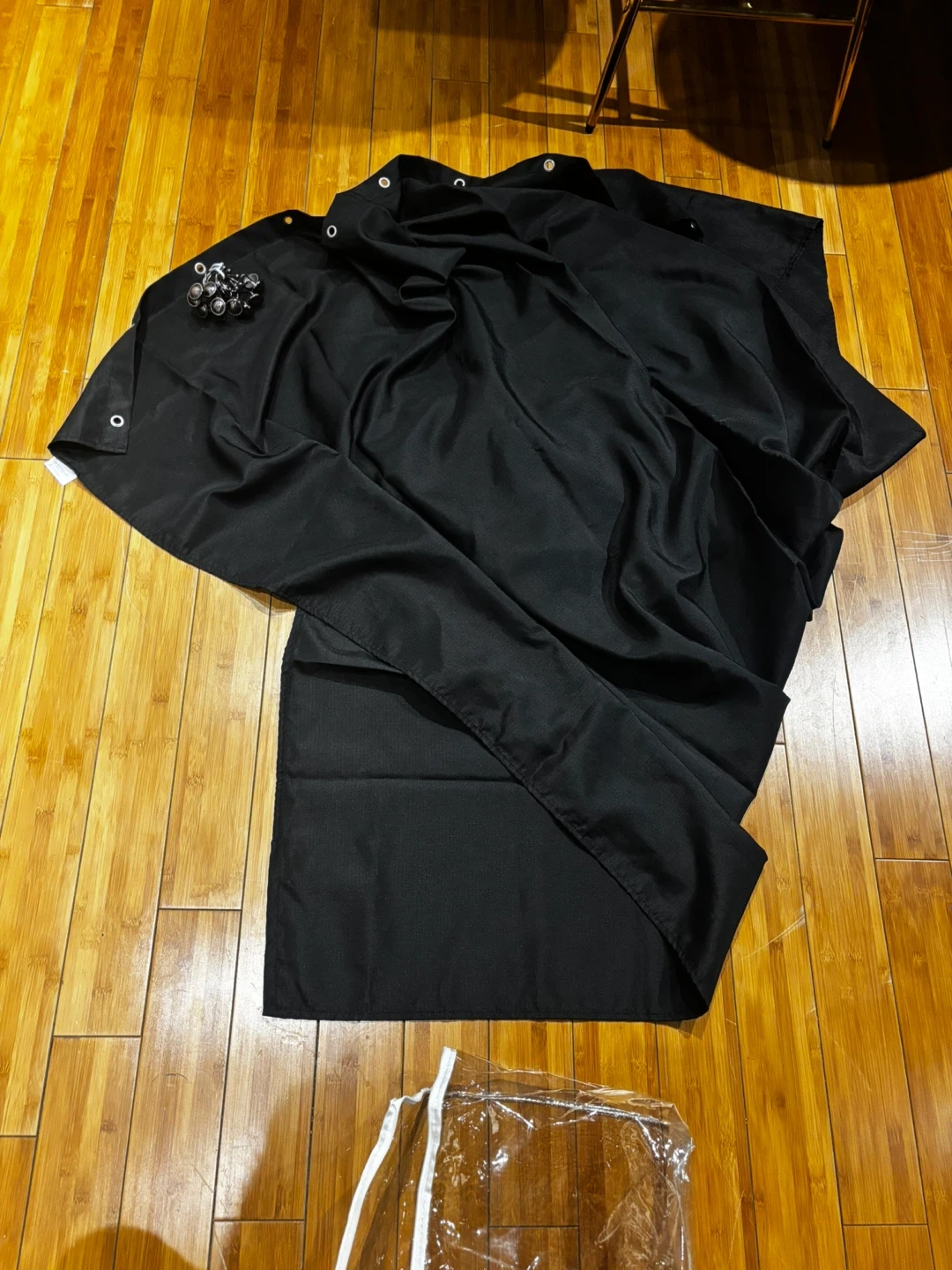 This is a U BTTN shower curtain made of 100% polyester. It comes with a set of metal hooks. It's machine washable cold and should not be bleached. The curtain is black and includes the original clear zipper bag. 72”-72 ”.