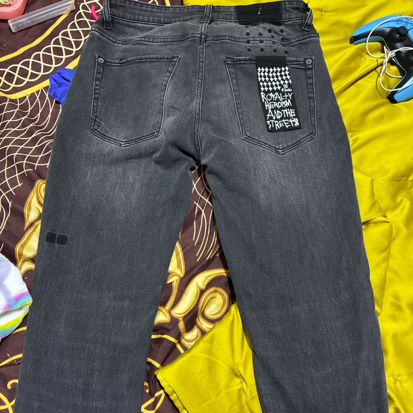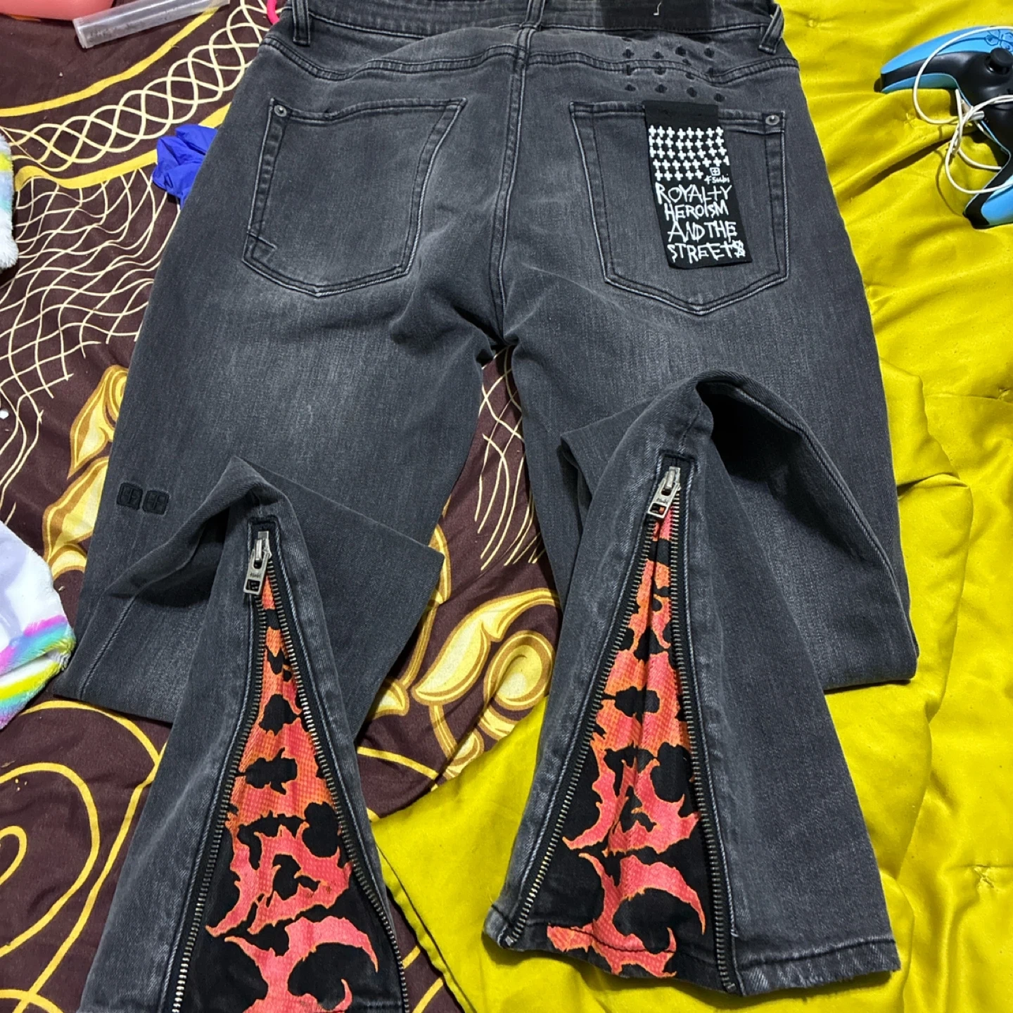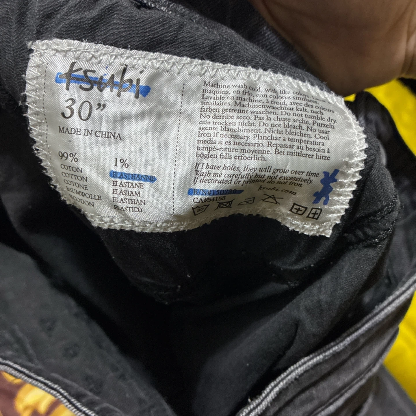 KSUBI jeans in a size 30. These grey denim pants feature zipped ankle openings with a unique red and black lining. Made from 99% cotton and 1% elastane for comfort and fit.