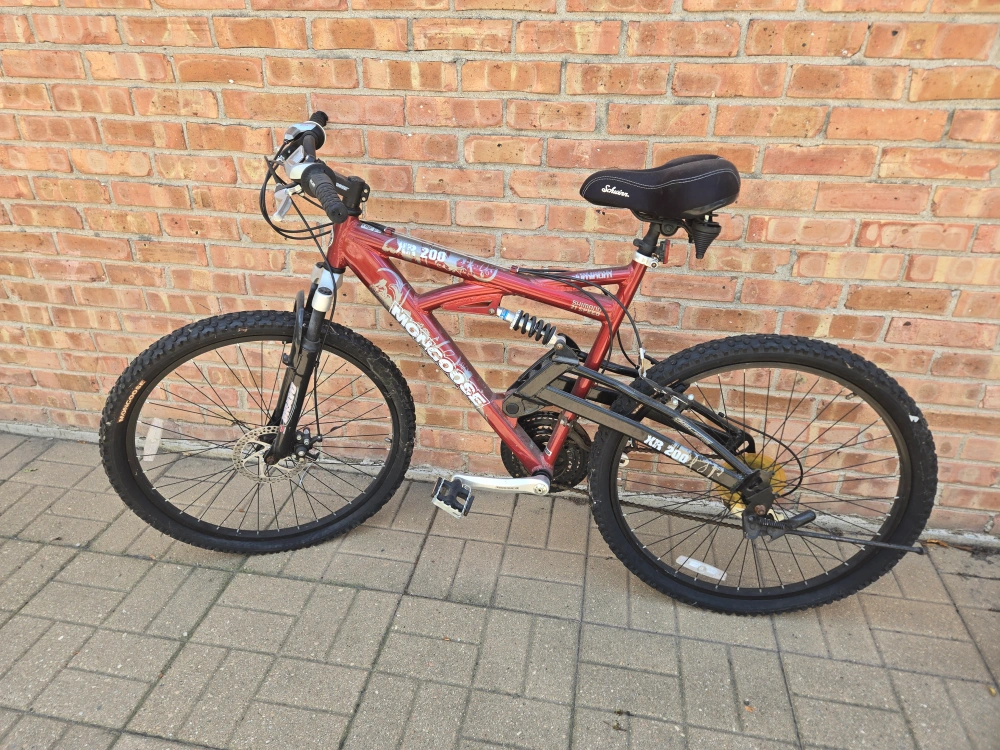 Selling a Mongoose XR 200 mountain bike! It's red and black and ready for some adventures. The bike features a suspension system for a smoother ride on rough terrain