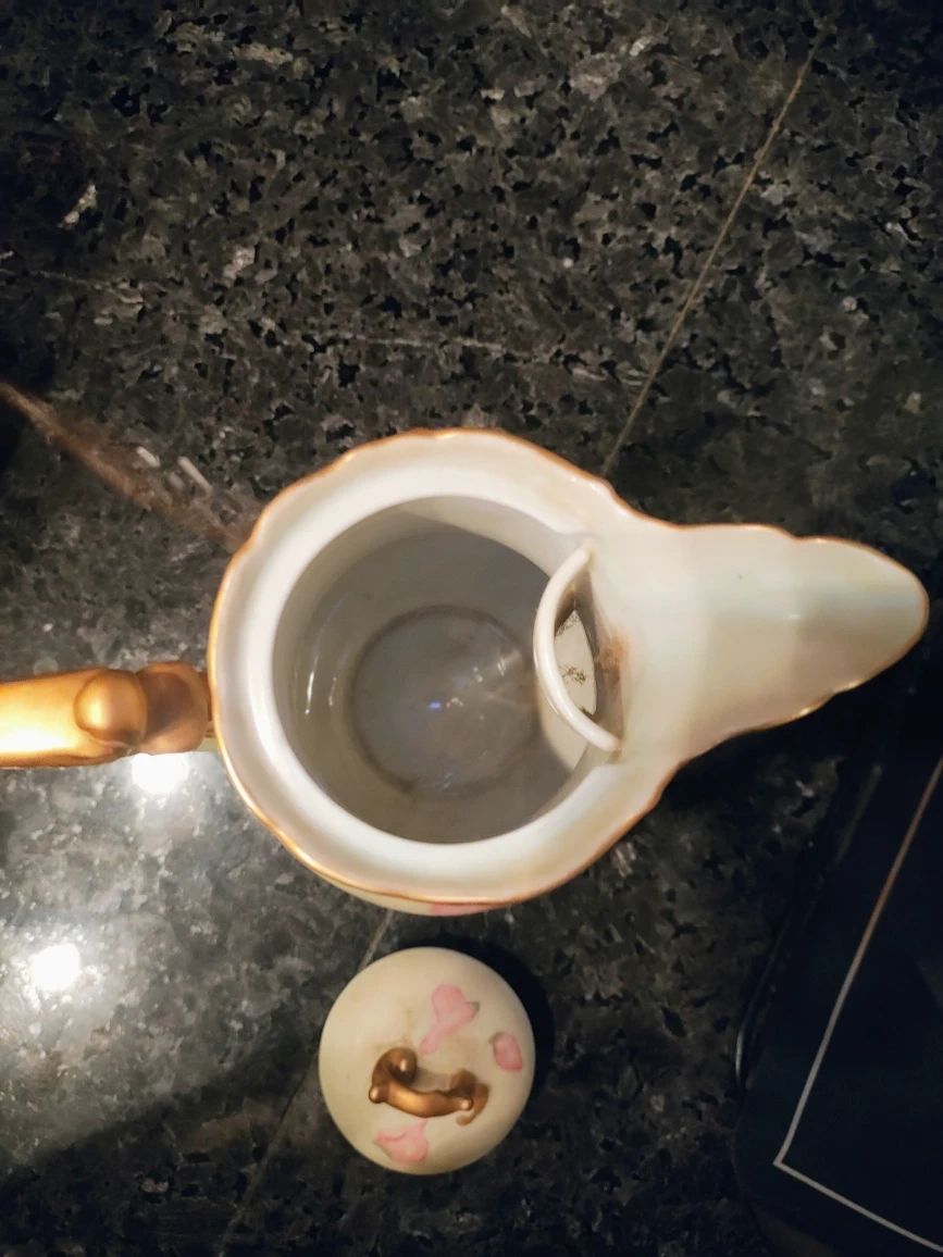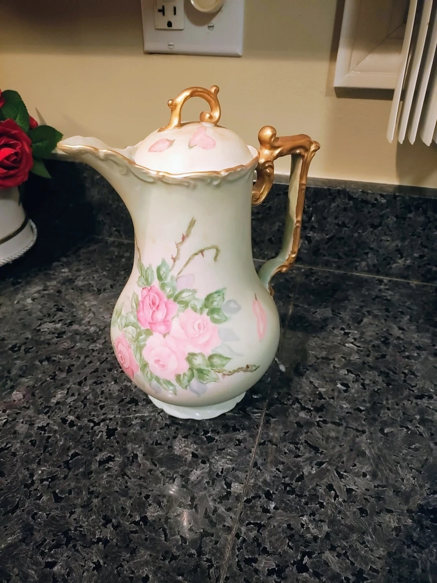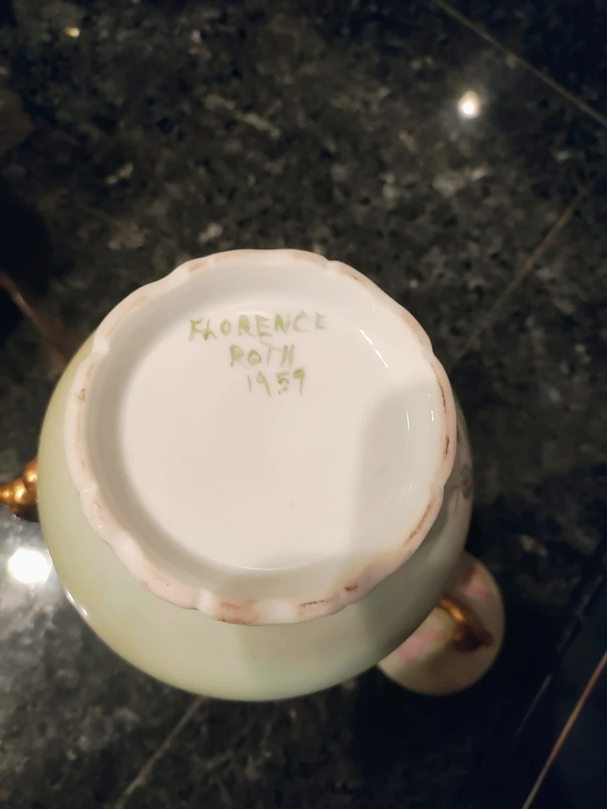Selling a Chocolate pot.. It says Florence Roth 1959 on the bottom. It features a delicate design with pink floral accents and gold trim. A charming piece for any collection!