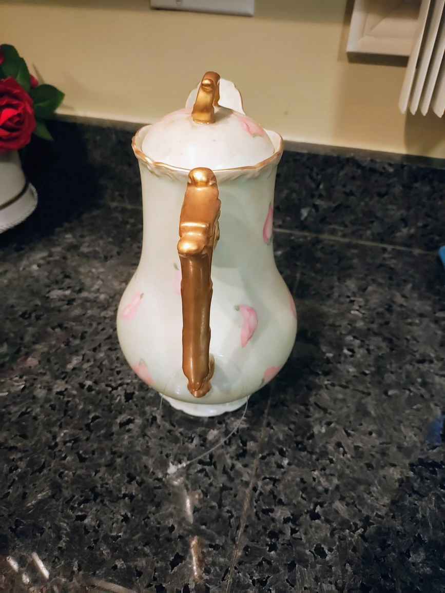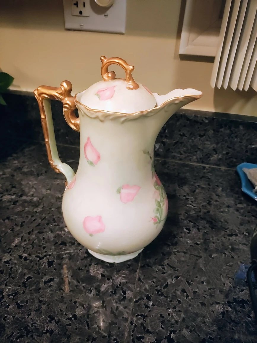 Selling a Chocolate pot.. It says Florence Roth 1959 on the bottom. It features a delicate design with pink floral accents and gold trim. A charming piece for any collection!
